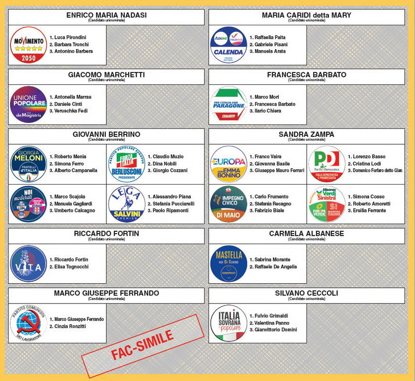 Per Fratelli d'Italia, alla Camera plurinominale: Matteo Rosso, Maria Grazia Frijia, Claudio Cavallo e Costanza Bianchini. Per il collegio plurinominale al Senato: Roberto Menia, Simona Ferro e Alberto Campanella. Per il Senato nel collegio uninominale: Gianni Berrino.