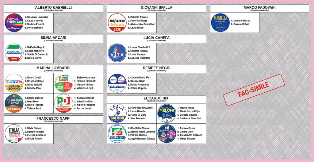 In presenza di più liste collegate in coalizione, il voto è ripartito tra le liste della coalizione, in proporzione ai voti ottenuti da ciascuna lista in tutte le sezioni del collegio uninominale. Il voto espresso tracciando un segno sul contrassegno della lista vale anche per il candidato uninominale collegato mentre, quello espresso tracciando un segno sul nome del candidato uninominale collegato a più liste in coalizione viene ripartito tra le liste in proporzione ai loro voti ottenuti nel collegio uninominale. Sotto le liste per Camera e Senato e i candidati.
