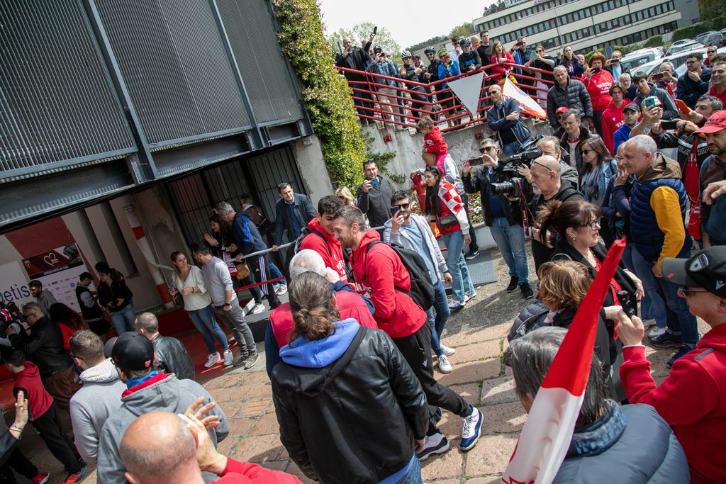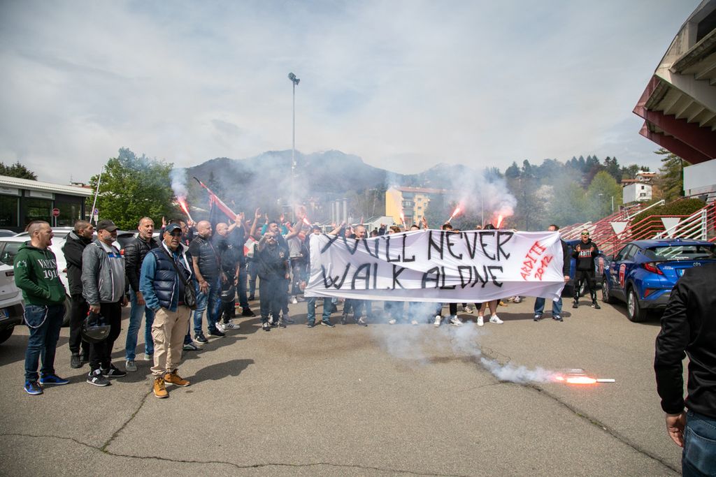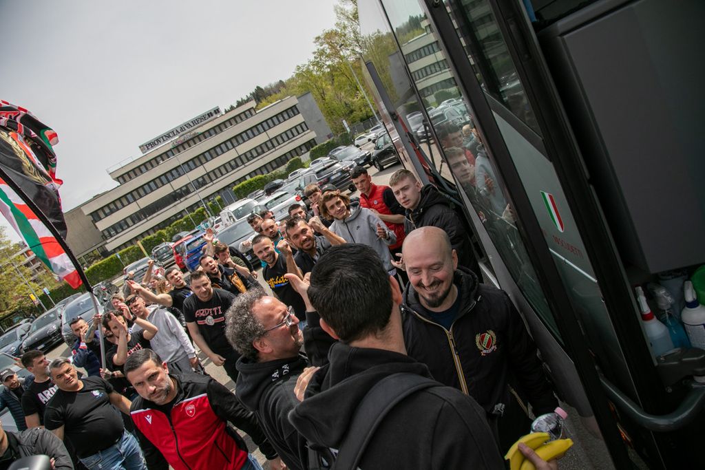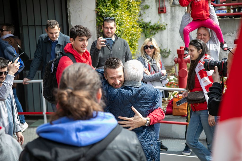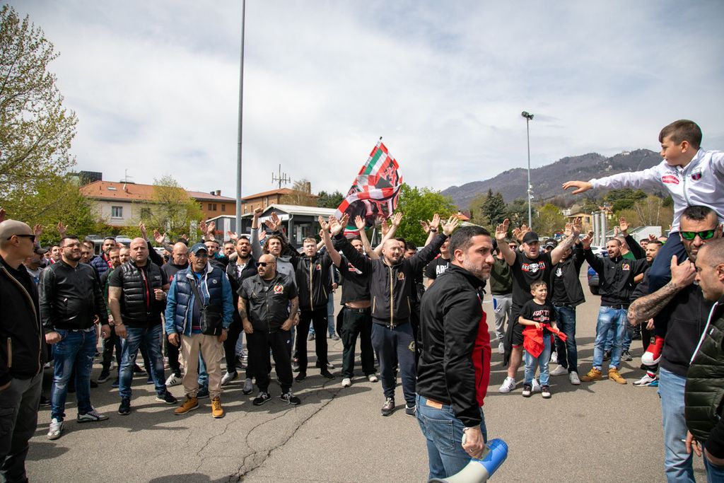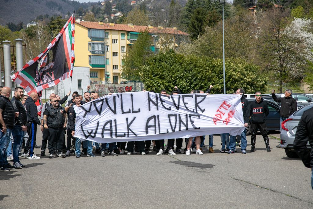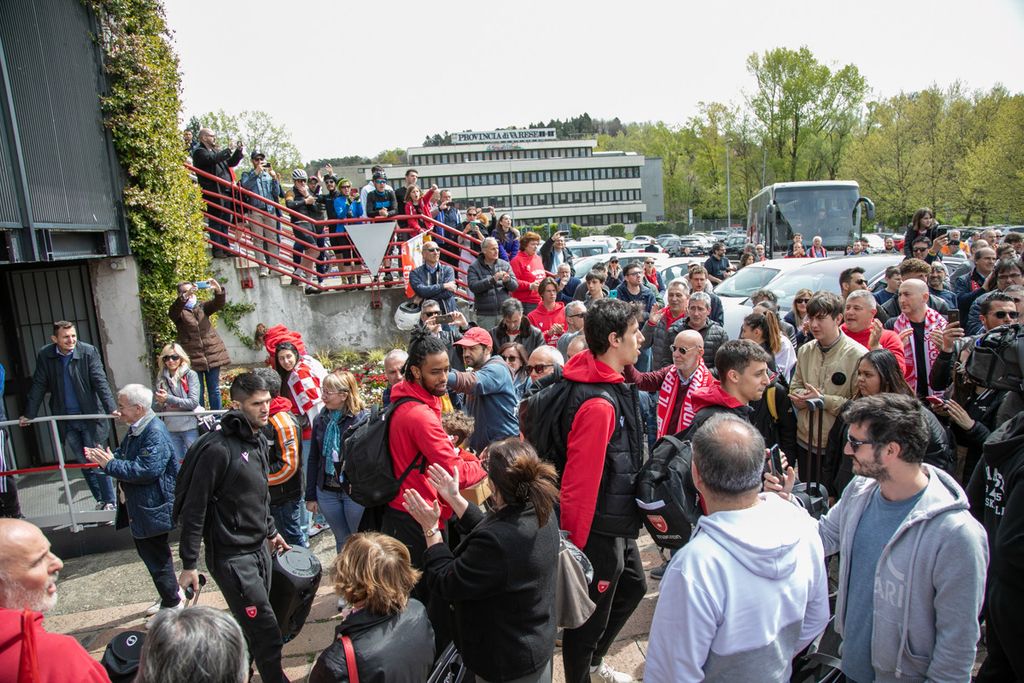 Le prime persone hanno iniziato ad arrivare verso le 12.30 e sono cresciute fino alle 14, quando alla spicciolata hanno cominciato a uscire i primi giocatori, poco dopo l'arrivo della Curva con lo striscione "You never walk alone". Cori, pacche sulle spalle e “cinque alti” per tutti.