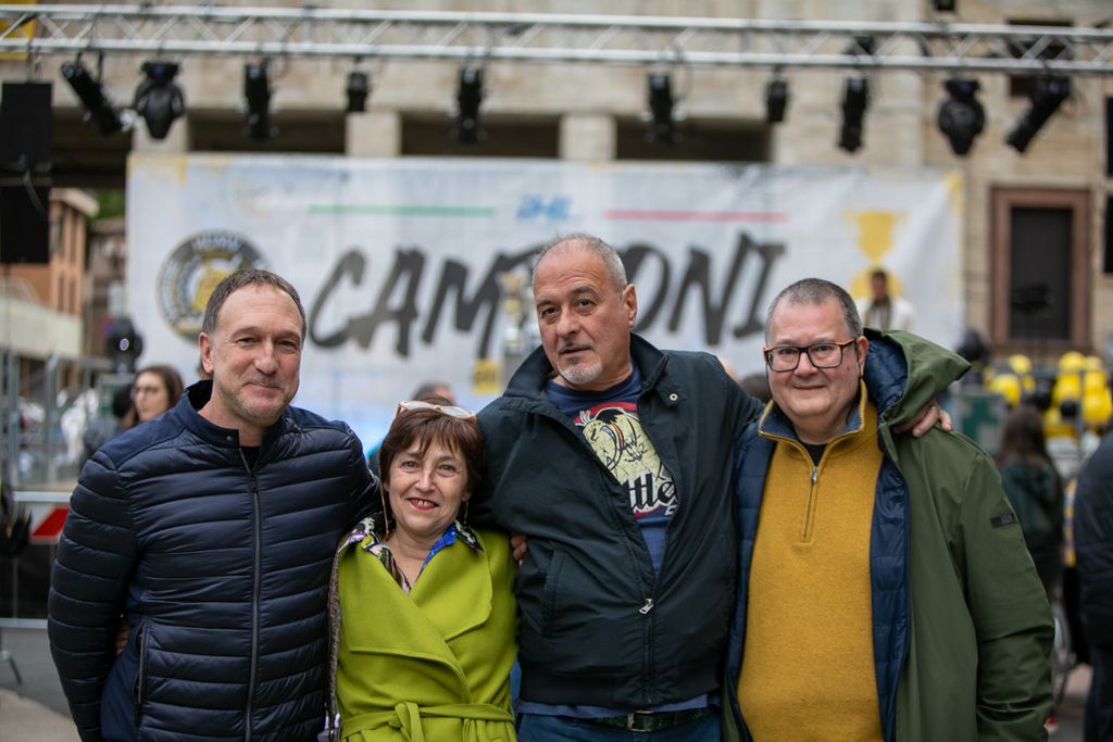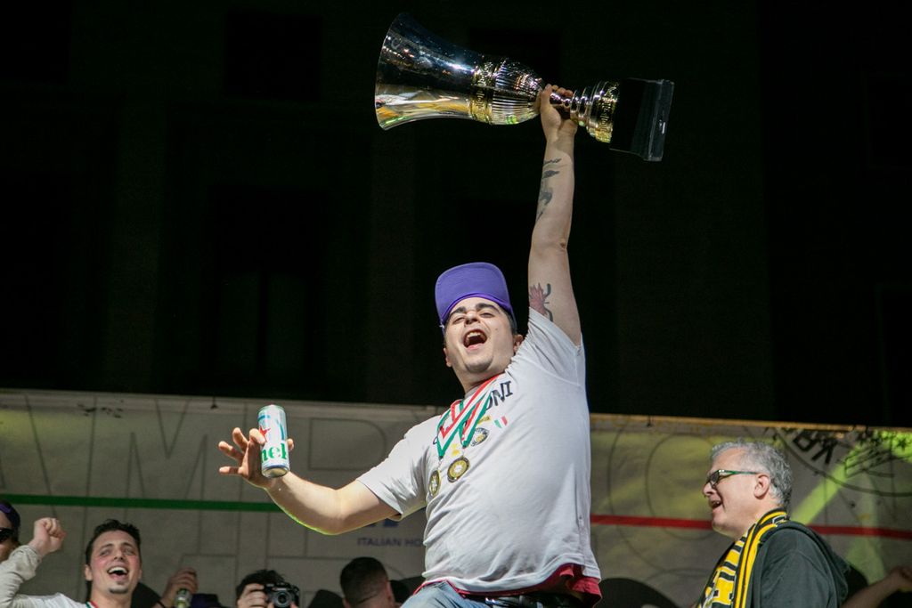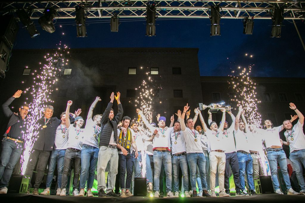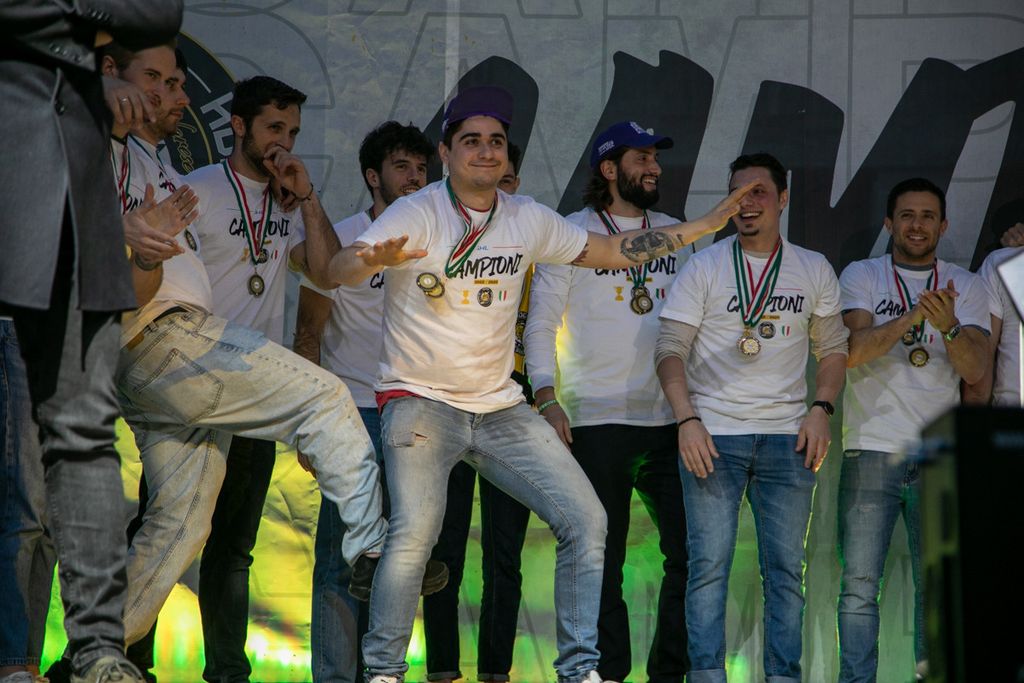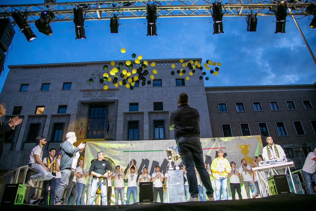 I re del campionato e della Coppa Italia si presentano pochi minuti prima delle 20, accolti dal tripudio della gente. A uno a uno, dal paratutto Rocco Perla a Daniele Odoni, passando per coach Claude Devèze e il presidente Carlo Bino, salgono sul palco, in un momento di grande emozione che però è solo un antipasto. A un certo punto si alzano infatti in volo i palloncini gialloneri per l’Arcobaleno di Nichi, per Erika Gibellini, per Tommaso Teruggia e, ovviamente, per Marco Fiori, rispettando la promessa di inizio campionato. E così, l’urlo “campioni campioni” è arrivato anche al cielo, dove in effetti doveva arrivare.