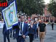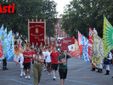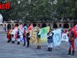 Solenne e fiero, l’Alfiere sorregge l’effige della città, la bandiera del libero comune. Vestito di rosso e verde sormonta uno degli edifici più antichi di Asti, il Complesso del Battistero di San Pietro