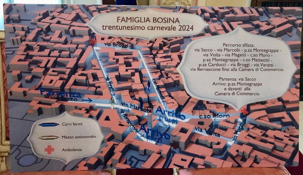 La sfilata di sabato 17 febbraio partirà alle 14.30 da via Sacco (per i carri, i gruppi partiranno invece dall’adiacente via Veratti), attraverserà via Marcobi, piazza Monte Grappa, via Volta, via Magatti, corso Moro, corso Matteotti, piazza Carducci, via Broggi e via Veratti. A questo punto i carri andranno a posizionarsi sotto la Camera di Commercio, mentre i gruppi transiteranno nuovamente per via Marcobi e ritroveranno i carri in piazza Monte Grappa.