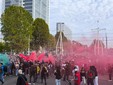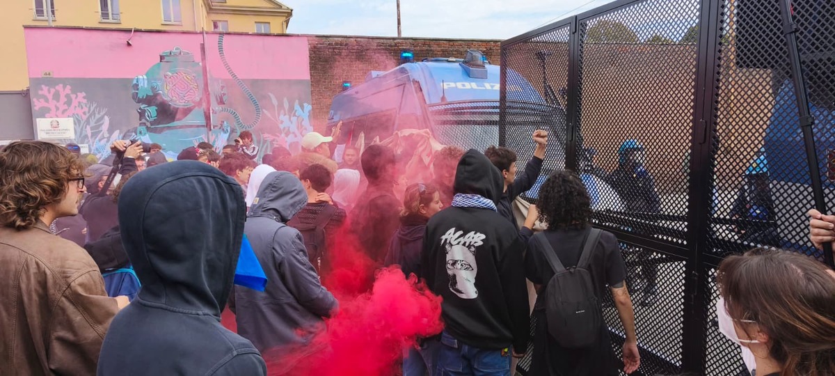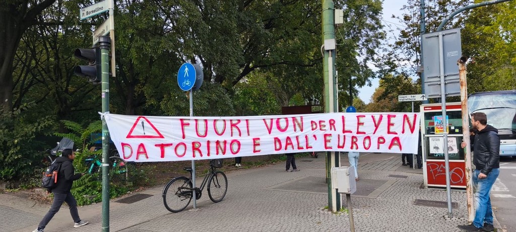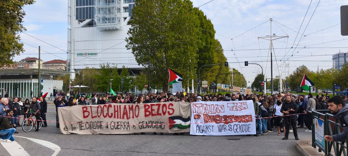 Mentre in città si radunano migliaia di persone di fronte al Comune, per la prima manifestazione della giornata di sciopero generale per Gaza e la Flotilla, in corso Vittorio parte il distaccamento che andrà a contestare la presenza di Jeff Bezos, Ursula Von Der Leyen, John Elkann e l'azienda Leonardo alla Tech Week.