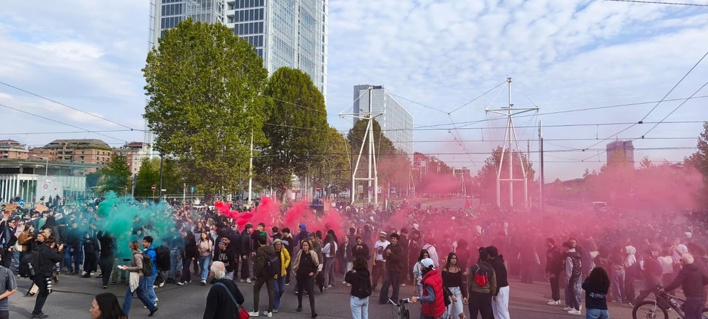 Ore 11.55 Da corso Ferrucci, la testa del corteo ha girato in via Nino Bixio, chiusa dalla polizia con due camionette. Lì, lancio di fumogeni e faccia a faccia tra qualche manifestante e la polizia, con le grate mobili a separare le due parti.