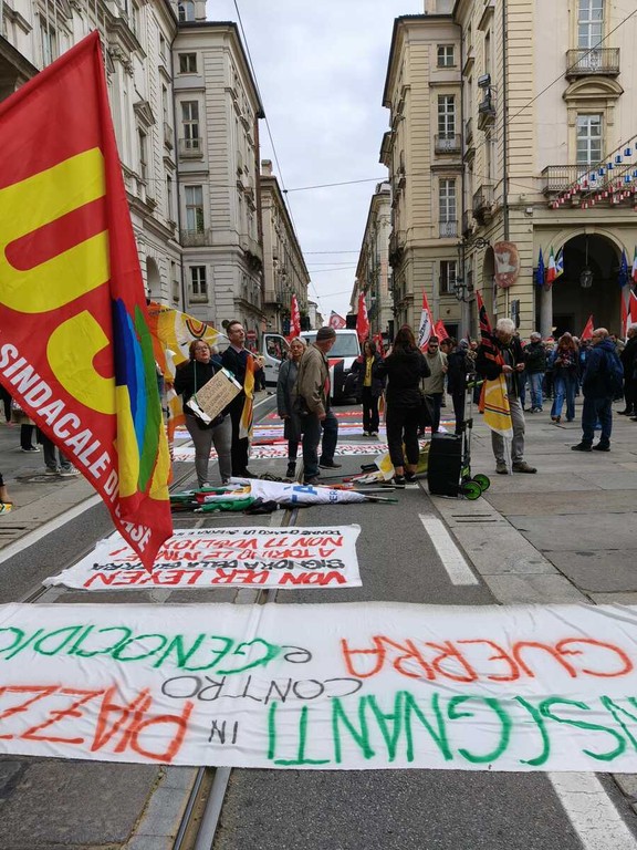 "Abbiamo indetto - chiarisce Giulia Bertelli della Cub Torino - uno sciopero senza alcun timore e paura: questa è opposizione civile all'aggressione nei confronti di Gaza, oltre alla mancata difesa del Governo alla Sumud Flottilla". "Noi - ha aggiunto - a bordo abbiamo il compagno Paolo De Montis: non sappiamo dove sia. Si aprirà un caso internazionale: siamo qua per riaffermare il diritto internazionale dei popoli, perché la Flotilla è stata attaccata in acque internazionali. Siamo qua contro tutte politiche di guerra".