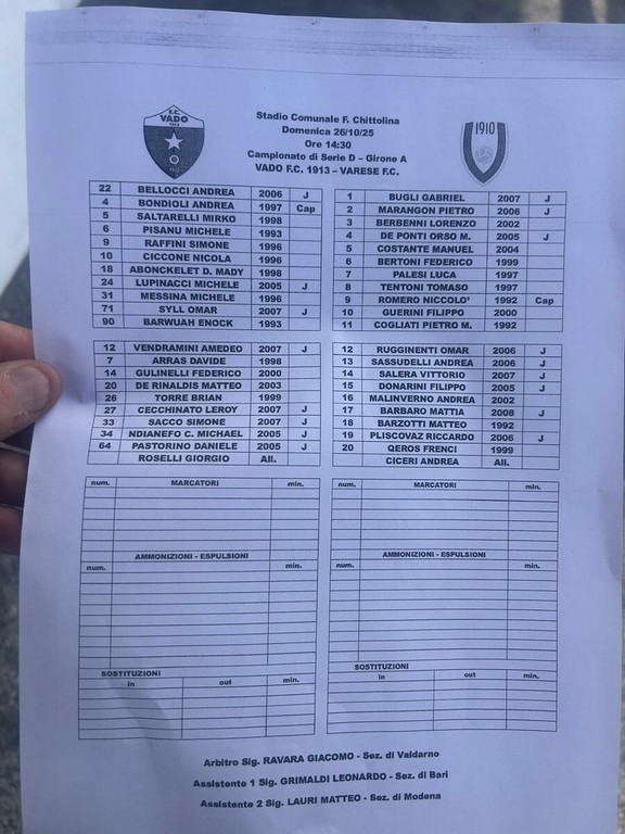 Vado (3-5-2): Bellocci, Saltarelli, Messina, Bondioli; Syll, Abonckelet, Pisanu, Ciccone, Lupinacci; Raffini, Barwauh. A disp.: Vendramin, Arras, Gulinelli, De Rinaldis, Torre, Cecchinato, Sacco, Ndianefo, Pastorino. All.: Giorgio Roselli