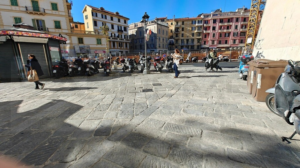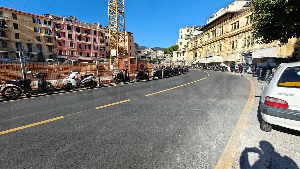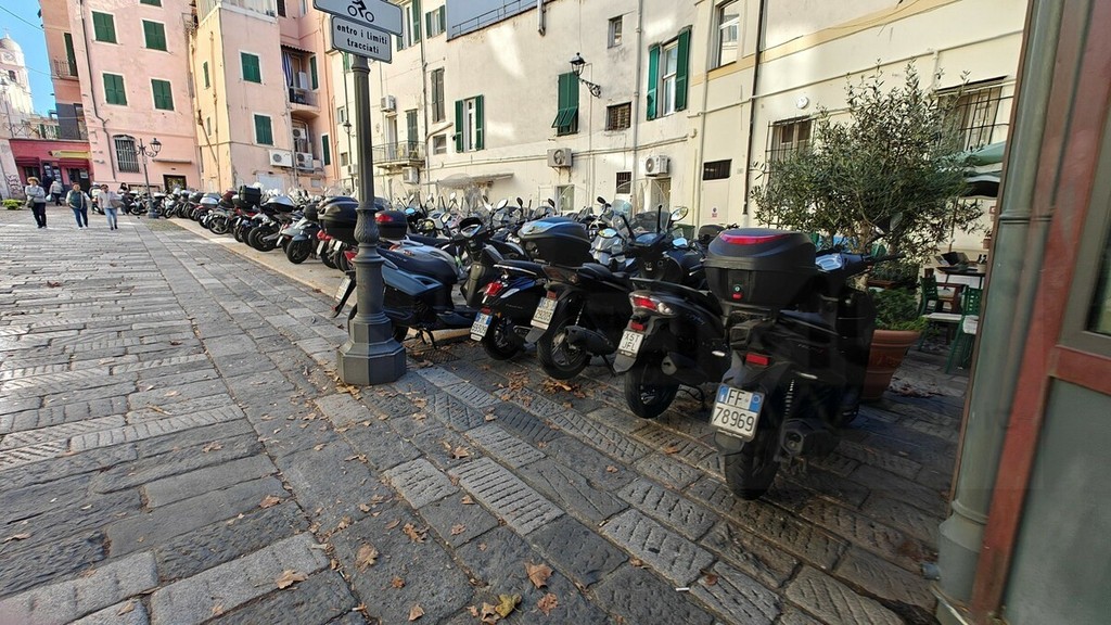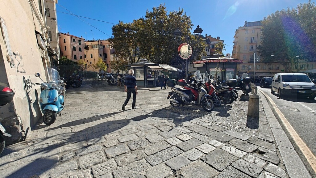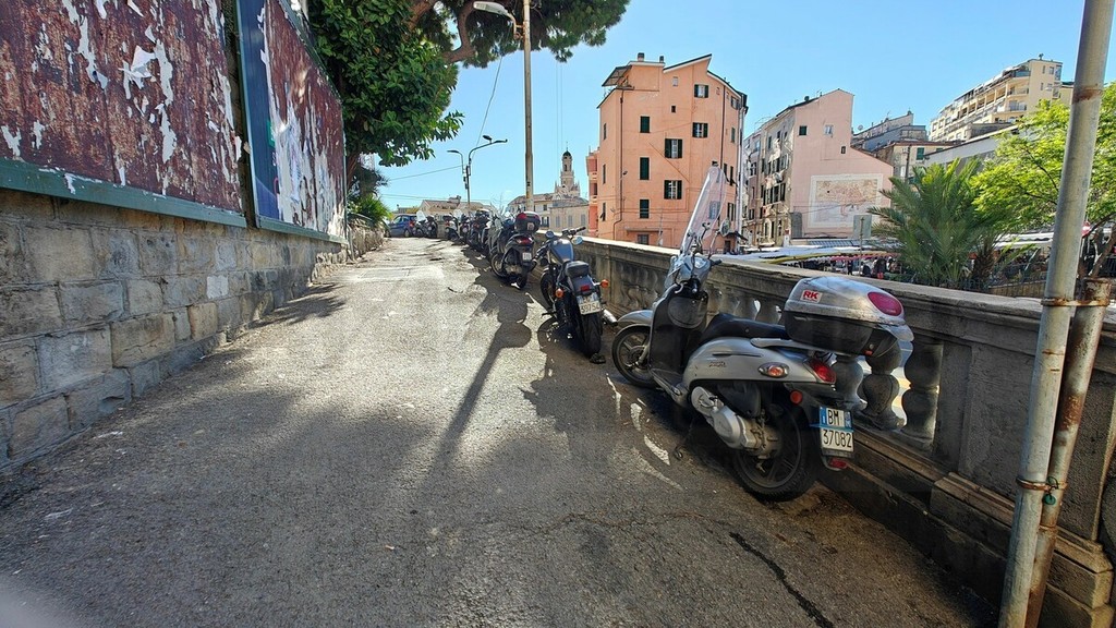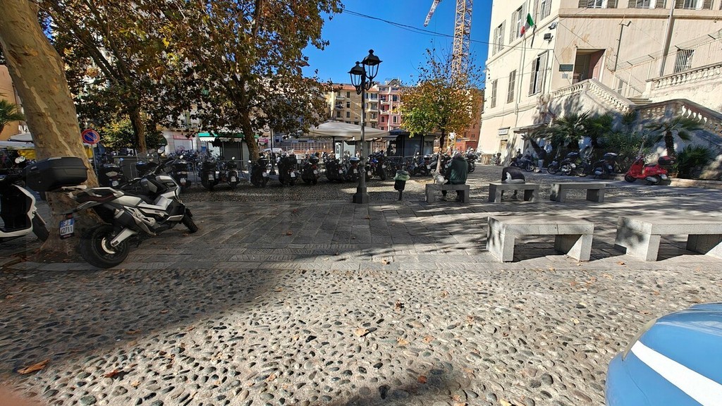 Discorso a parte (lo abbiamo volutamente lasciato per ultimo) merita piazza Eroi Sanremesi e le zone limitrofe. Da mesi – e ancora per un po’ – è presente il cantiere del costruendo parcheggio ma, di fatto, la zona un tempo destinata agli scooter, quando non c’era il mercato, sarà sostituita dalla nuova area pubblica con dehors, quindi non più utilizzabile. Con la scuola vicina, ora i ragazzi trovano qualche spazio nell’area predisposta dal Comune in piazza Muccioli. Ma, come si vede dalle foto, la piazza è totalmente invasa da moto e scooter, oltre che (quando il carico e scarico lo necessita) dai mezzi di Amaie Energia per il vicino punto di consegna della differenziata. L’area di fronte alla piazza, da molti denominata Siro Carli, è di vera anarchia, dove gli scooter hanno invaso la carreggiata e dove trovano posto anche alcune auto. Le zone attigue al cantiere sono diventate parcheggi di fatto per moto, che arrivano a occupare anche il camminamento pedonale. Il marciapiede vicino alla torre Saracena è un nuovo parcheggio selvaggio, così come l’inizio di via Martiri e la strada che porta alla città vecchia.