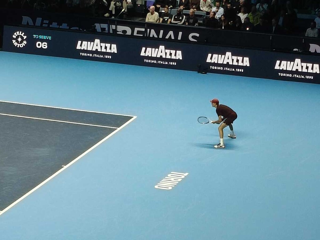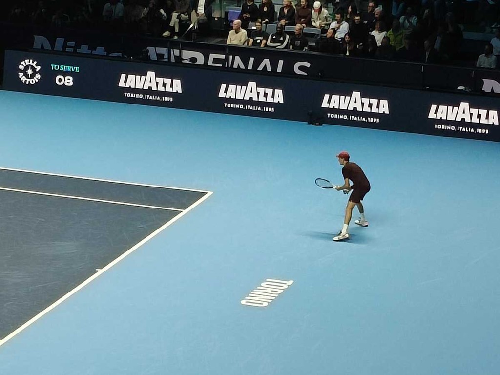 A quel punto la platea ha intonato "Olè, olè, olè Sinner", a sostegno dell'italiano, reduce da alcuni errori non da Sinner. Sugli spalti presenti il sindaco Stefano Lo Russo, l'assessore ai Grandi Eventi Mimmo Carretta, Giuseppe e Francesca Lavazza, oltre al campione di casa Lorenzo Sonego, applauditissimo dal pubblico. Sul servizio di Sinner comunque non si gioca e alla terza occasione l'azzurro riesce a strappare la battuta al rivale chiudendo 7-5 in 58 minuti, con la folla letteralmente esplosa dopo il punto che ha deciso la prima frazione.