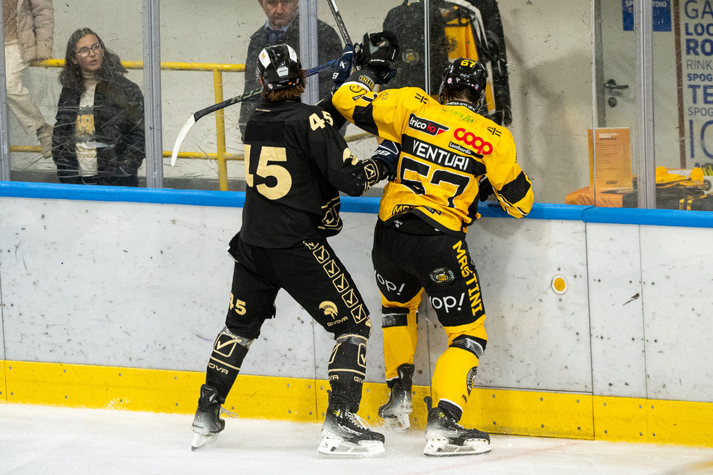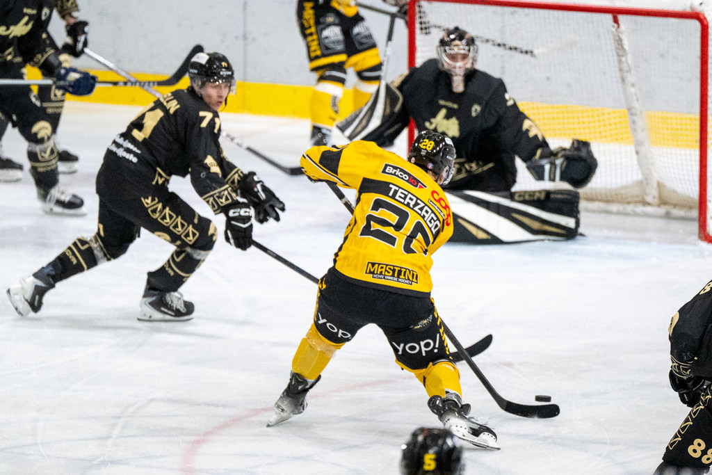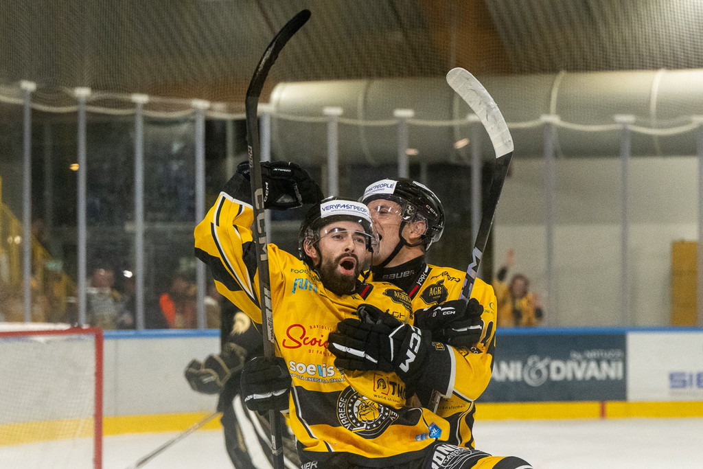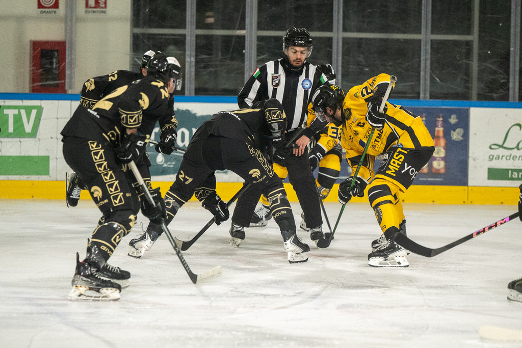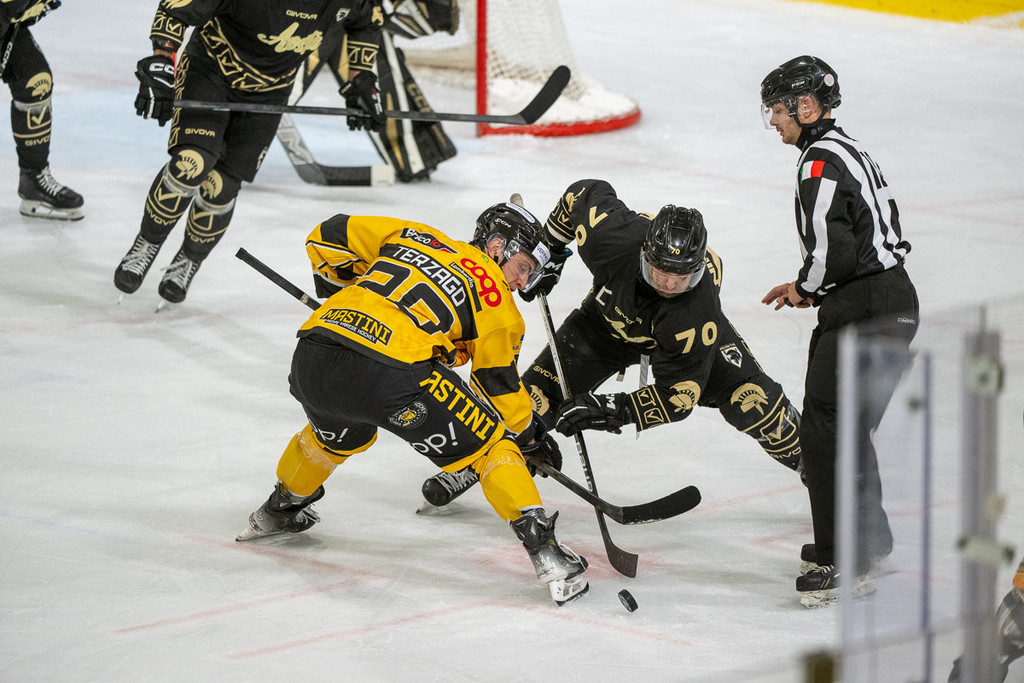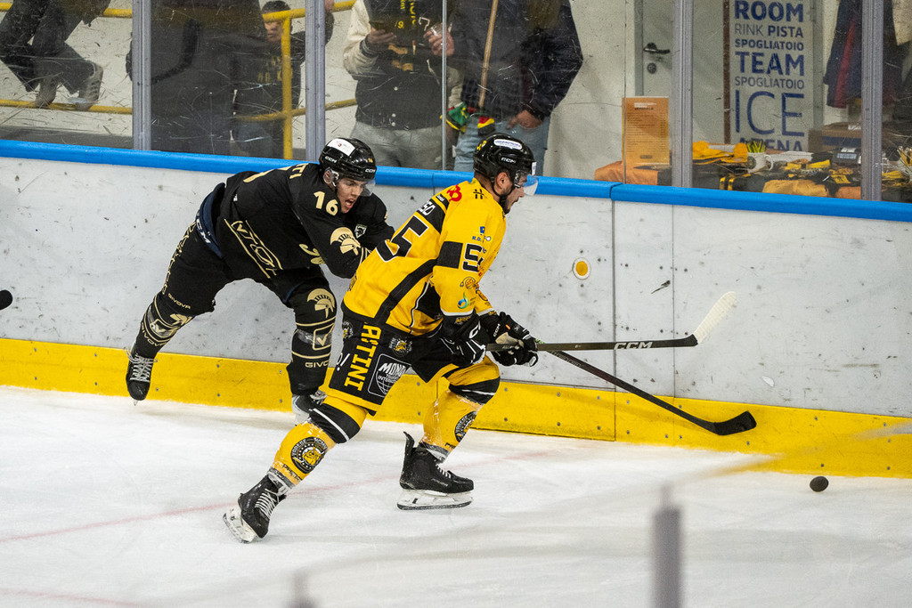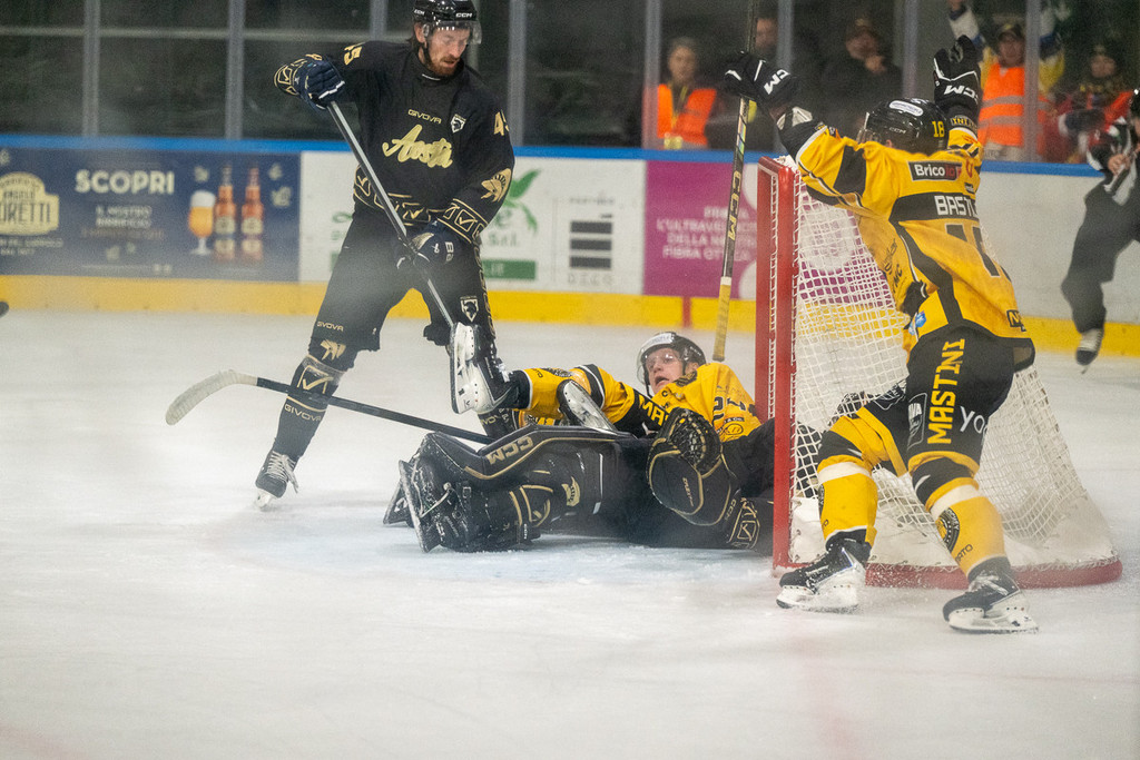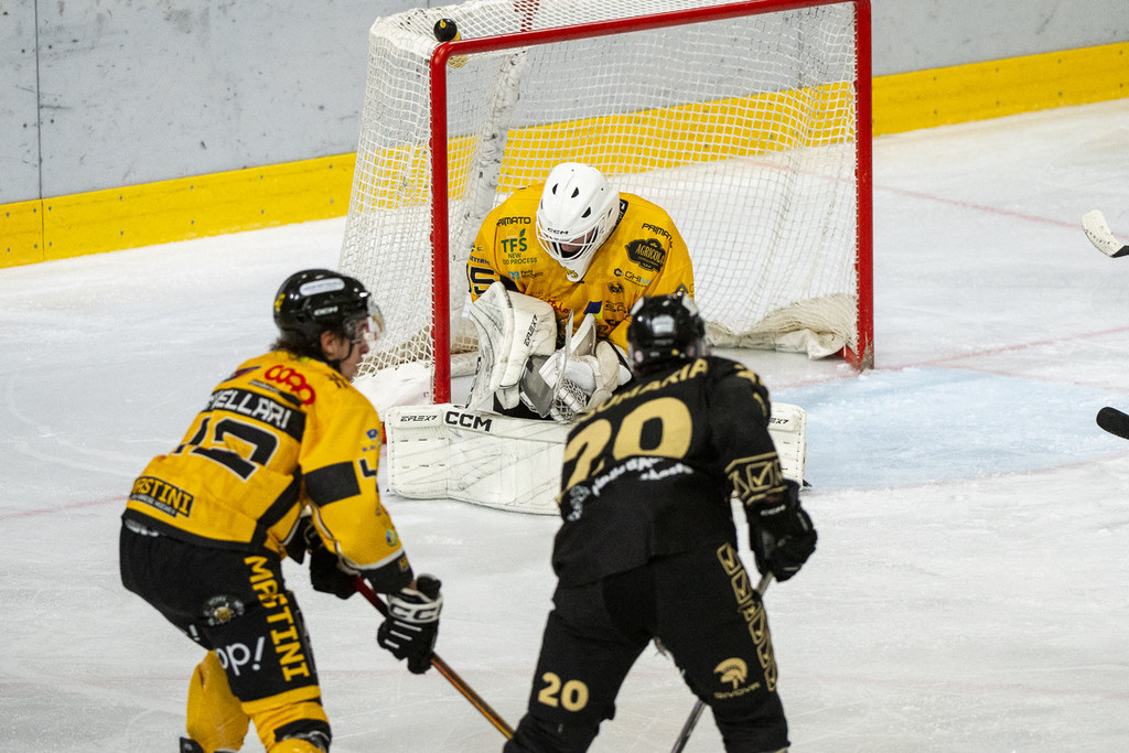 Fraschetta e poi Nardella, il pericolo numero da 103 punti della scorsa stagione, che scocca il primo tiro al 18' in power play ben parato. Mastini assassini sul gol, realizzato in inferiorità numerica in contropiede con la linea delle meraviglie: Terzago, che ha gli occhi anche sulle spalle, vede il gemello Bastille piombare davanti a Perla, lo serve ed è il vantaggio. Sono i gialloneri a creare l'occasione del raddoppio con Bertin, solo ma murato da Perla e con Pizzo.