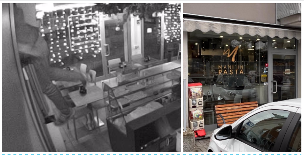 Tutta la scena è stata ripresa dalle telecamere di cui l'esercizio commerciale è dotato: «Ha agito con una calma disarmante e a volto scoperto - spiegano i titolari del "Mani in Pasta" con un sentimento tra amarezza e disillusione - E' arrivato in bicicletta, ha studiato per un po' la scena. Poi ha tentato di forzare l'ingresso con un arnese da scasso. Non riuscendoci ha girato intorno al negozio ed è passato dalla finestrella sopra la vetrina. Il tutto con una tranquillità che lascia senza parole».
