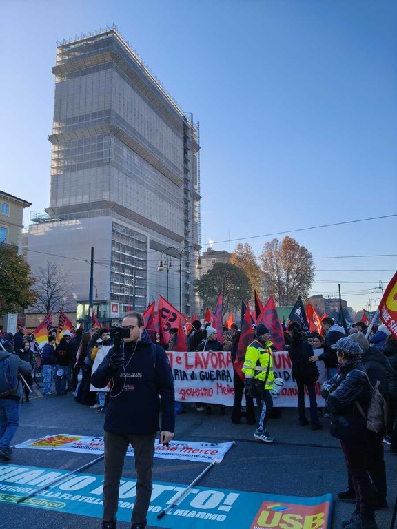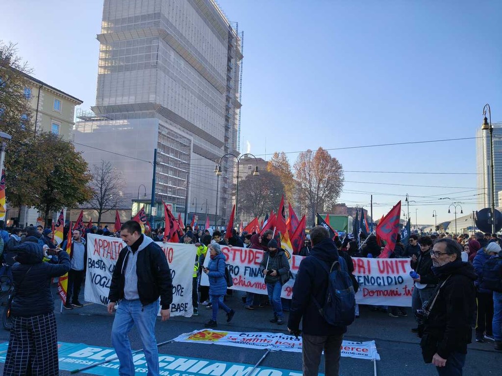 E sono le centinaia le persone che questa mattina si sono ritrovate davanti all'ex Porta Susa, dai sindacati Cobas ed USB, pro Palestina, studenti degli istituti superiori,.... In testa al serpentone gli striscioni "Giù le armi, su i salari", "Non un euro per la guerra" e "Blocchiamo tutto! A difesa della Palestina".