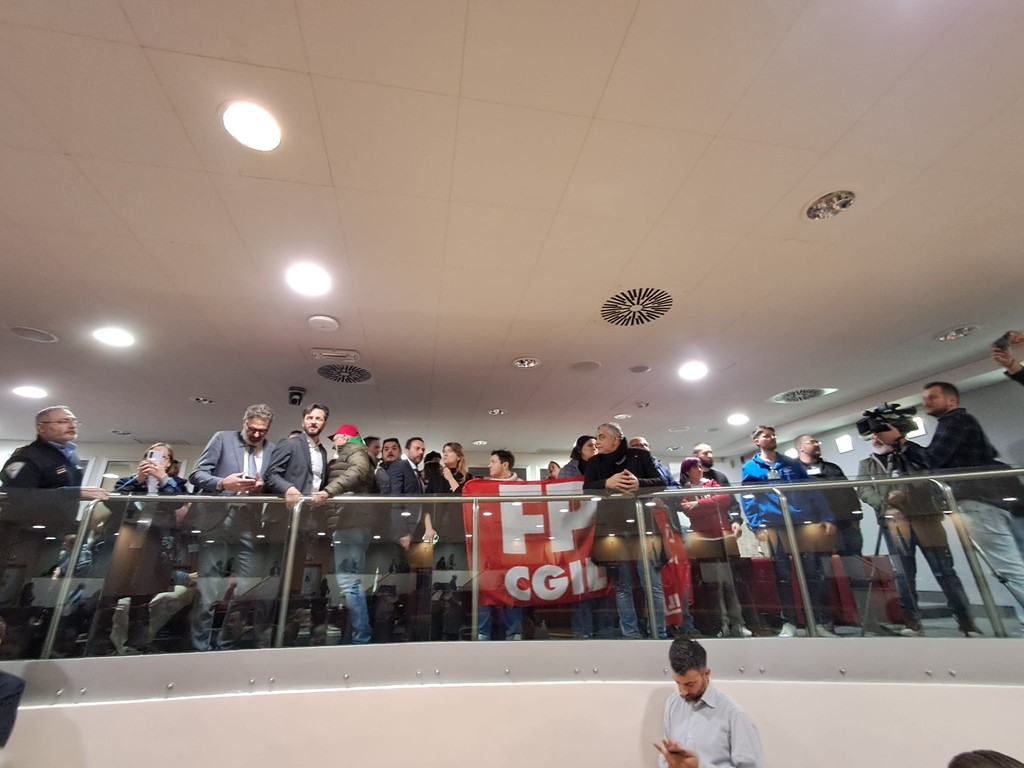 I sindacati hanno poi contestato animatamente i lavori del consiglio regionale, all'urlo di "vergogna", "buffoni", "andate a casa". I manifestanti hanno chiesto una sospensione e di essere ascoltati in conferenza di capigruppo. Ma la faccenda si è risolta in una parentesi di caos, durante la quale l'opposizione ha deciso di abbandonare l'aula. Il testo è stato quindi approvato senza la minoranza, con alcuni emendamenti e ordini del giorno dell'opposizione votati nonostante l'assenza dei proponenti.
