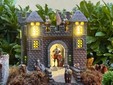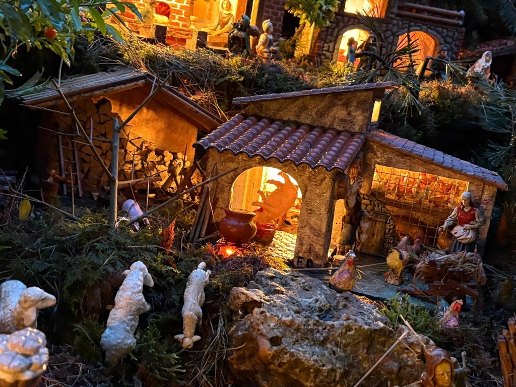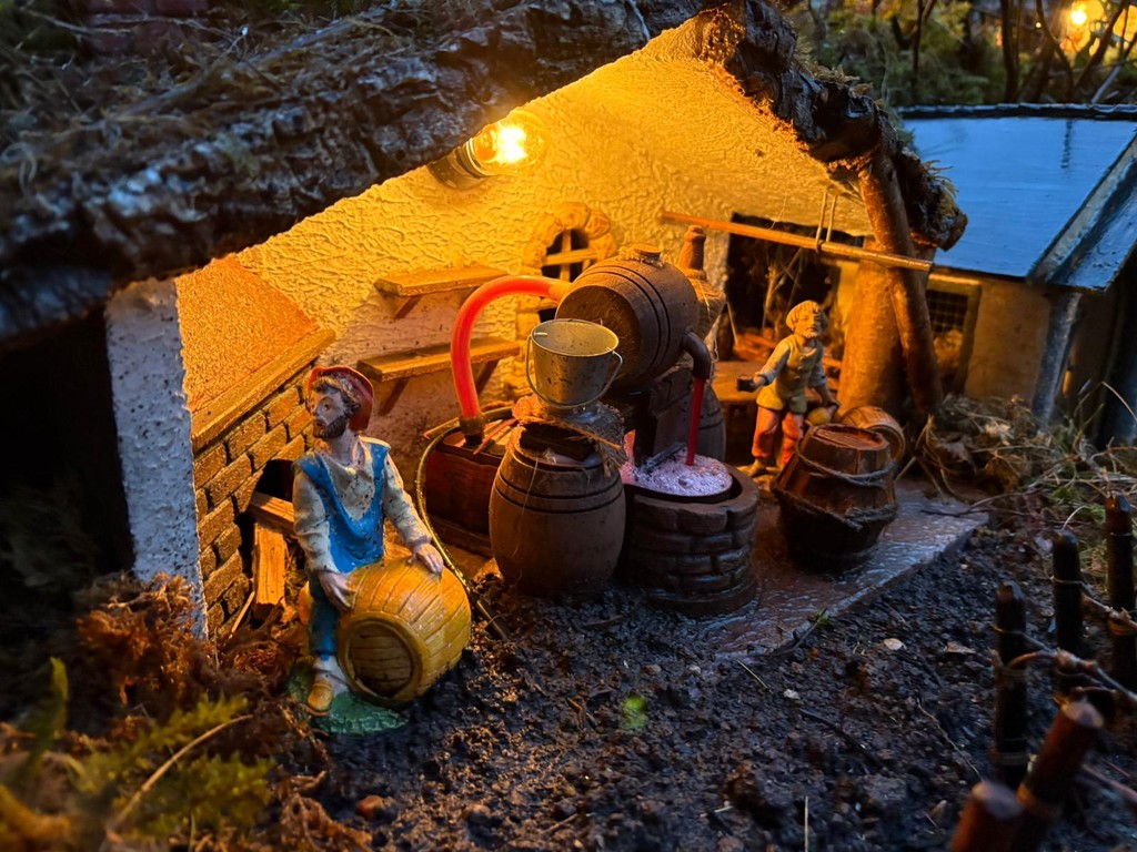 Dentro il presepe convivono le statuine tradizionali e una mappa affettiva che racconta le origini della famiglia. C’è il Monviso, simbolo del Piemonte, da cui scende acqua vera, a rappresentare il Po che nasce e attraversa la pianura. Poco più in là il vigneto lascia colare vero Barbera dalla botte, accanto alla polenta che richiama la cucina di casa. Il viaggio continua verso sud. In Basilicata compare una chiesa che ricorda la cattedrale di San Gianuario di Marsico Nuovo, il paese della mamma. In Campania, terra dello zio, trovano spazio gli orti e i broccoli di Paternopoli, mentre la Calabria è raccontata attraverso le sue tradizioni più forti: il maiale appeso, i funghi sotto gli alberelli, scene di vita quotidiana che parlano di memoria e radici. Tra le montagne e i vicoli spunta anche un castello medievale, simbolo del castello di Erode, inserito come elemento scenografico che rompe l’armonia del paesaggio e ricorda il lato più oscuro del racconto natalizio.