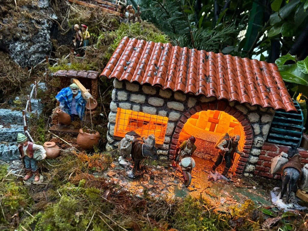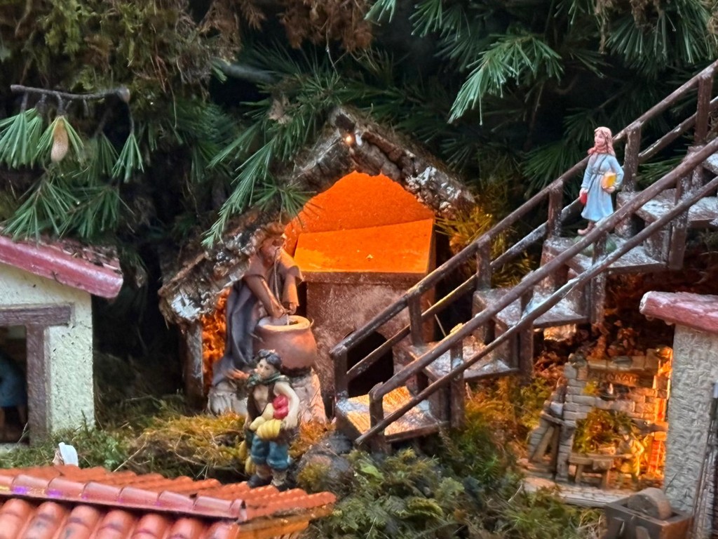 Alcune statuine prendono vita. Sono meccanizzate, animate nei gesti quotidiani: il fornaio, la pescivendola, il vasaio, l’uomo che prepara la polenta. Arrivano da una donazione della signora Antonella, così come altre figure che negli anni hanno arricchito la scena. C’è anche una statua in legno del 1900, silenziosa e preziosa, che porta con sé il peso del tempo.