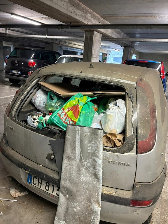 Il degrado non si limita alle sole auto (e già non sarebbe poco). Qua e là, tra le colonne portanti e la luce fioca, spuntano sacchi di macerie, carrelli dei supermercati, estintori svuotati, porte rotte e muri imbrattati. Un quadro di incuria e insicurezza. I residenti raccontano di un via vai sospetto soprattutto di sera, in una zona che in passato era già stata teatro di riciclaggio di motorini, poi arginato da interventi delle forze dell’ordine.
