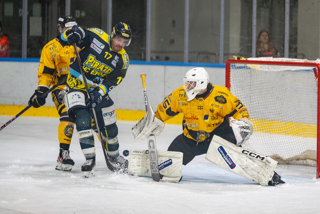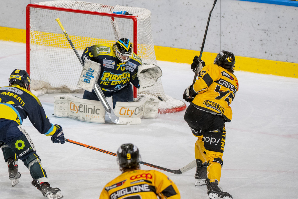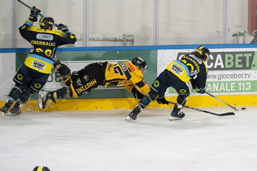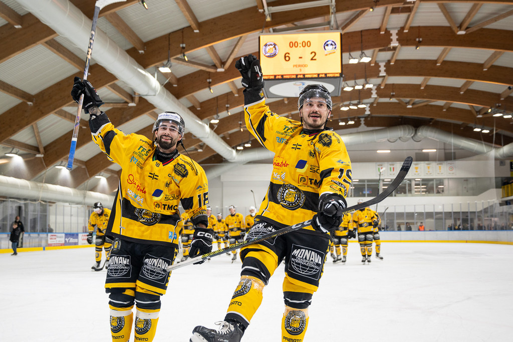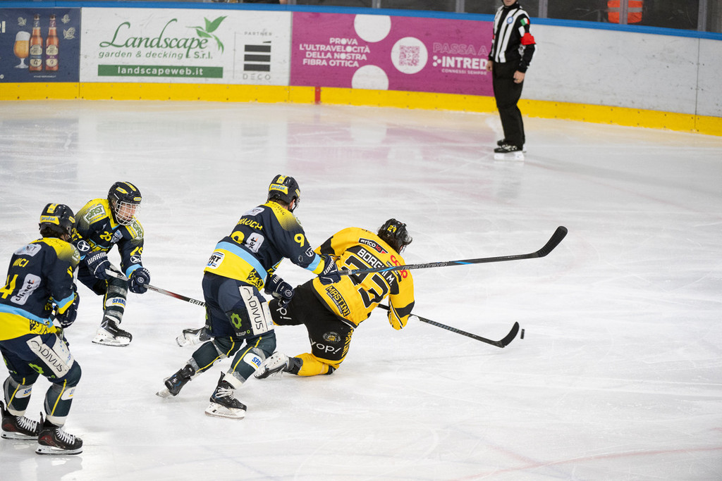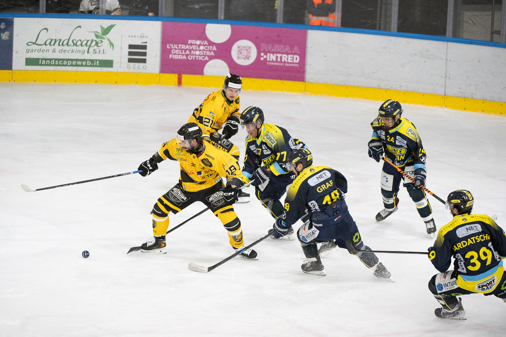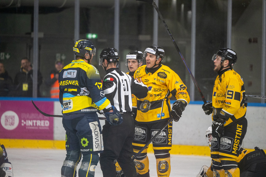 Il sottosopra e il cielo giallonero in un primo tempo folle. Il fondo di 8 minuti in superiorità (1'36" in 5 contro 3), dopo lo svantaggio dello 0-1 al primo tiro ospite subito da Pardatscher (tocco sotto porta), senza una vera occasione da gol, anzi rischiando anche lo 0-2 e, poi, in un lampo l'estasi e tutta la follia e la bellezza dell'hockey. Il cielo di due gol gialloneri in 21 secondi in inferiorità numerica, uno su un rigore preso e trasformato da Bastille (1-1 con disco nell'angolino dopo aver spiazzato il portiere), un altro su un magistrale contropiede di Terzago che ruba il disco e parte dalla blu per il 2-1, quindi il tris ancora di Bastille su numero a destra di Buono, che fa sedere mezzo Appiano, smarca Ghiglione per l'assist del 3-1 giallonero in nemmeno tre giri di lancetta. Poi ci pensano Eruzione e Williamson con una grande azione a riaprire tutto: 3-2. Pazzie da hockey.