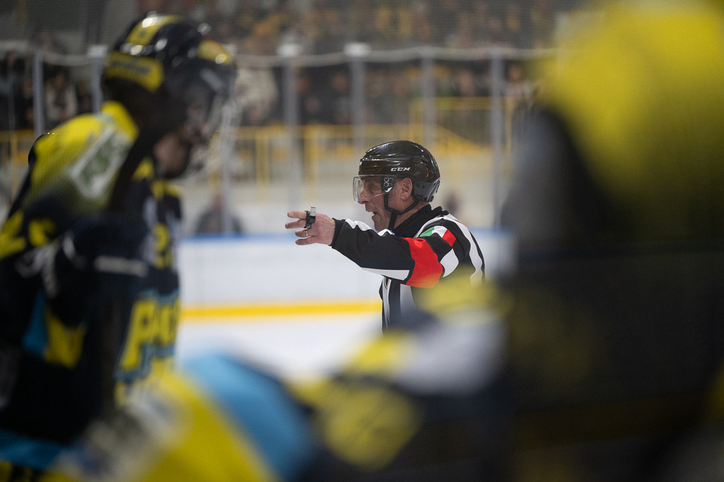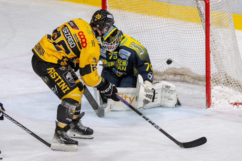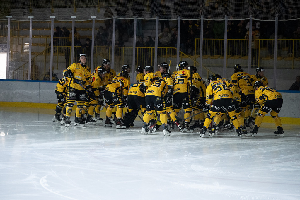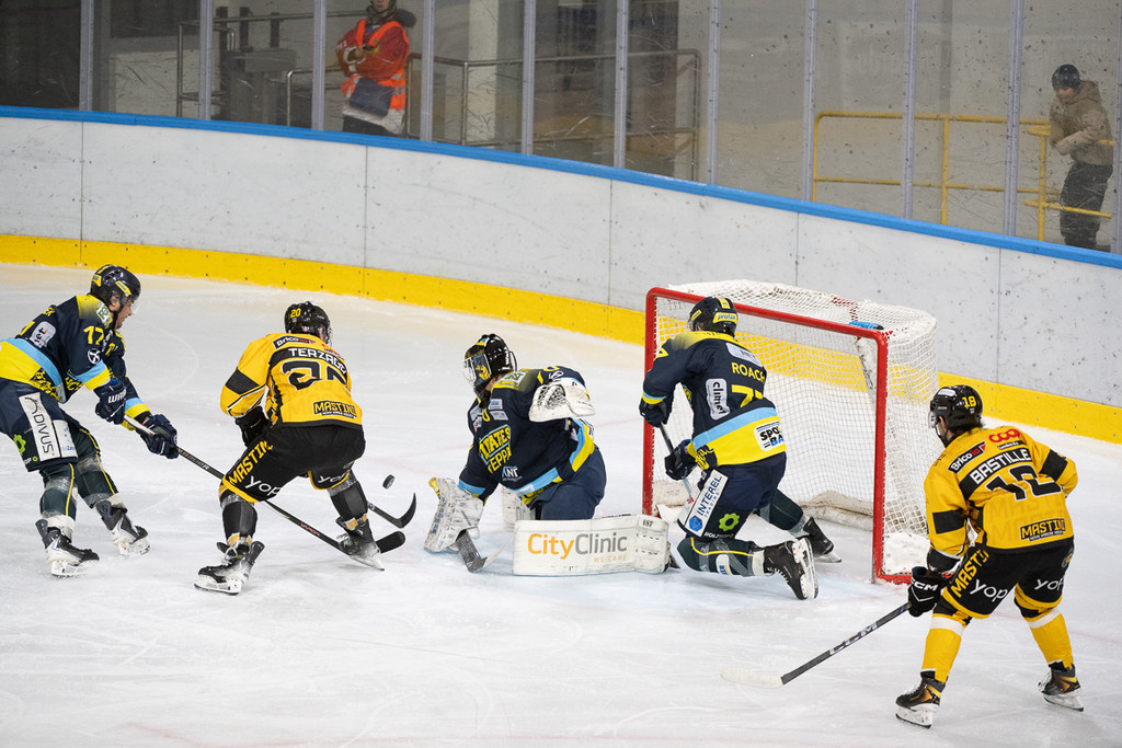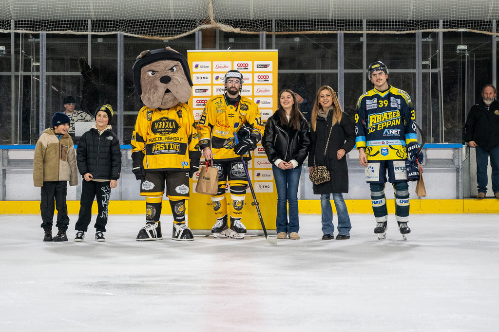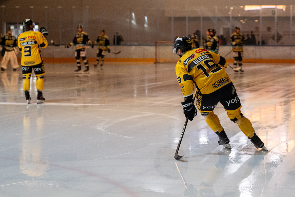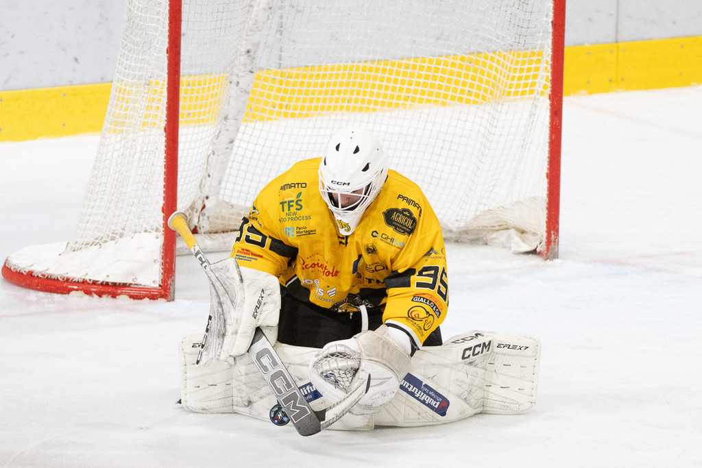 Il sottosopra e il cielo giallonero in un primo tempo folle. Il fondo di 8 minuti in superiorità (1'36" in 5 contro 3), dopo lo svantaggio dello 0-1 al primo tiro ospite subito da Pardatscher (tocco sotto porta), senza una vera occasione da gol, anzi rischiando anche lo 0-2 e, poi, in un lampo l'estasi e tutta la follia e la bellezza dell'hockey. Il cielo di due gol gialloneri in 21 secondi in inferiorità numerica, uno su un rigore preso e trasformato da Bastille (1-1 con disco nell'angolino dopo aver spiazzato il portiere), un altro su un magistrale contropiede di Terzago che ruba il disco e parte dalla blu per il 2-1, quindi il tris ancora di Bastille su numero a destra di Buono, che fa sedere mezzo Appiano, smarca Ghiglione per l'assist del 3-1 giallonero in nemmeno tre giri di lancetta. Poi ci pensano Eruzione e Williamson con una grande azione a riaprire tutto: 3-2. Pazzie da hockey.