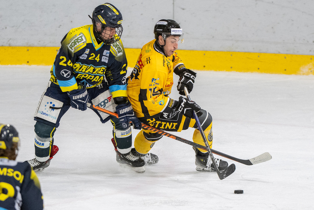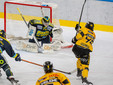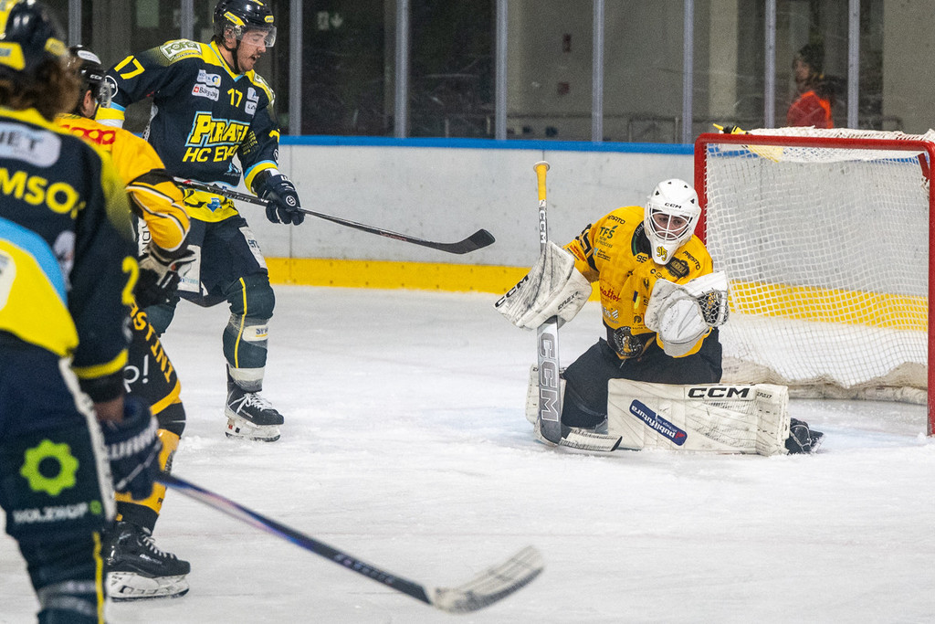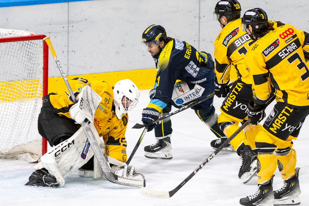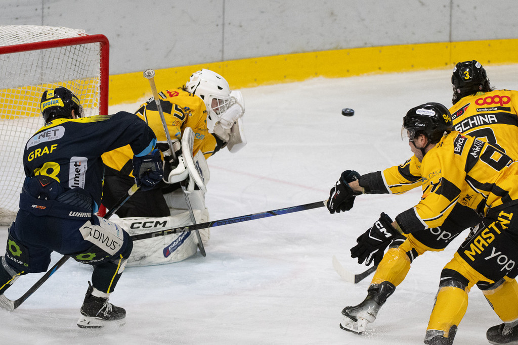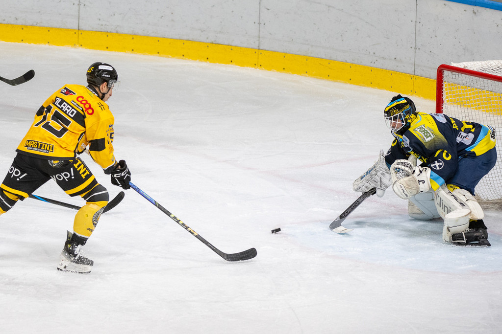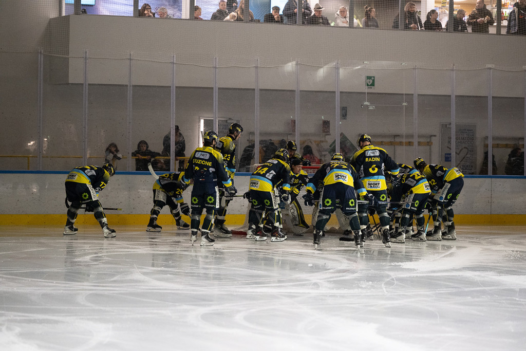Il sottosopra e il cielo giallonero in un primo tempo folle. Il fondo di 8 minuti in superiorità (1'36" in 5 contro 3), dopo lo svantaggio dello 0-1 al primo tiro ospite subito da Pardatscher (tocco sotto porta), senza una vera occasione da gol, anzi rischiando anche lo 0-2 e, poi, in un lampo l'estasi e tutta la follia e la bellezza dell'hockey. Il cielo di due gol gialloneri in 21 secondi in inferiorità numerica, uno su un rigore preso e trasformato da Bastille (1-1 con disco nell'angolino dopo aver spiazzato il portiere), un altro su un magistrale contropiede di Terzago che ruba il disco e parte dalla blu per il 2-1, quindi il tris ancora di Bastille su numero a destra di Buono, che fa sedere mezzo Appiano, smarca Ghiglione per l'assist del 3-1 giallonero in nemmeno tre giri di lancetta. Poi ci pensano Eruzione e Williamson con una grande azione a riaprire tutto: 3-2. Pazzie da hockey.
