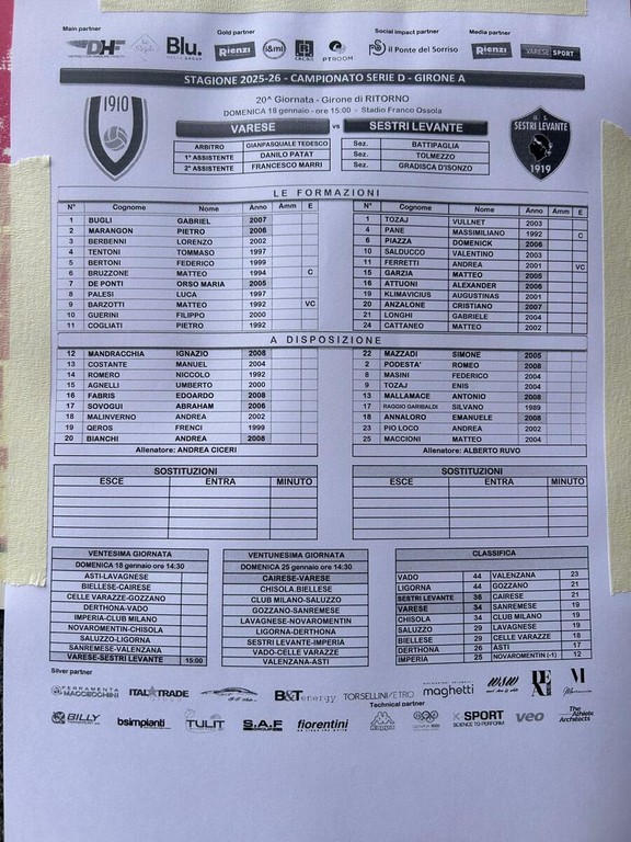 Varese-Sestri alle 15 al Franco Ossola vale il terzo posto: liguri avanti di 2 punti, imbattuti da 11 gare (6 vittorie e 5 pari) e mai sconfitti in trasferta (7 vittorie e 3 pari) in questo campionato, biancorossi reduci dalla folle e bellissima vittoria di Chisola (4-3) e da una serie positiva di 8 partite (5 i successi). Di più: Vado e Ligorna, a braccetto davanti a tutti a +10 sul Varese, giocano due gare altrettanto difficili a Tortona e Saluzzo. Chissà mai che il vincitore di Masnago possa ancora giocarsi qualche chance. Ciceri, che domenica scorsa ha fatto debuttare Cavalli e Sovogui, tiene sul filo del rasoio le ultime scelte anche se, ovviamente, Barzotti è il baluardo attorno a cui ruota tutto il resto. Occhio tra i liguri, squadra tosta e da battaglia che ha accolto anche l'ex Maccioni, all'attaccante lituano Klimavicius.