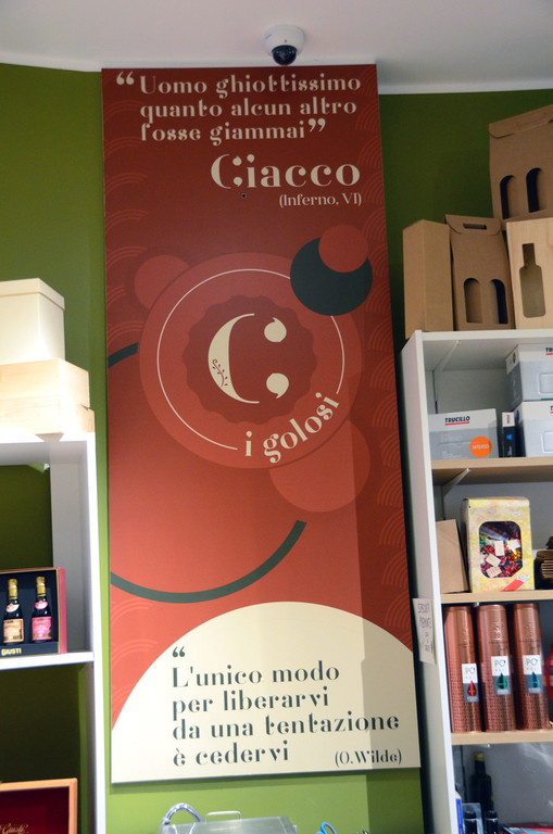 Ecco allora saltar fuori il testimone per eccellenza della «dannosa colpa de la gola», quel Ciacco che si presenta a Dante e Virgilio nel sesto canto dell’Inferno, costretto nel girone dei golosi e definito da Giovanni Boccaccio come «morditore» nonché imbucato in banchetti trimalcioneschi, dove «v’andava, e similmente, se invitato non era, esso medesimo s’invitava». Nel negozio di via del Cairo ci sono infatti pannelli che riportano i versi danteschi ma anche una citazione di Oscar Wilde: «L’unico modo per liberarvi di una tentazione è cedervi».