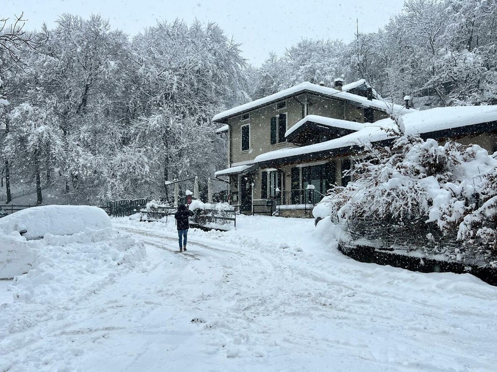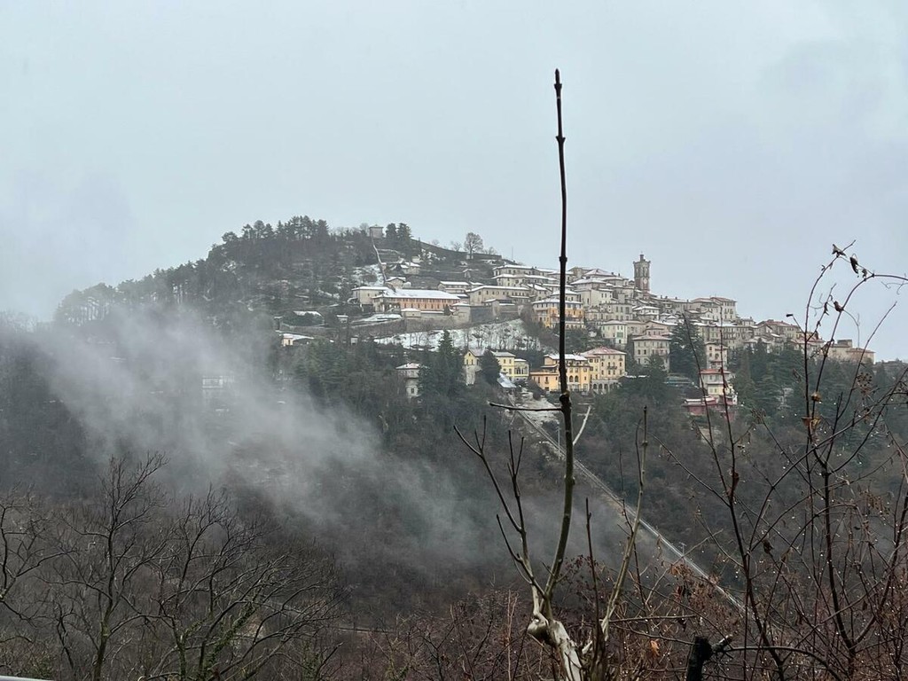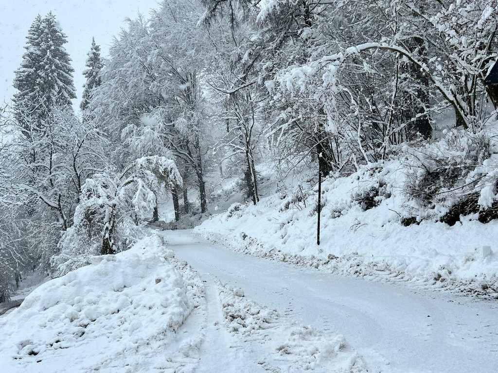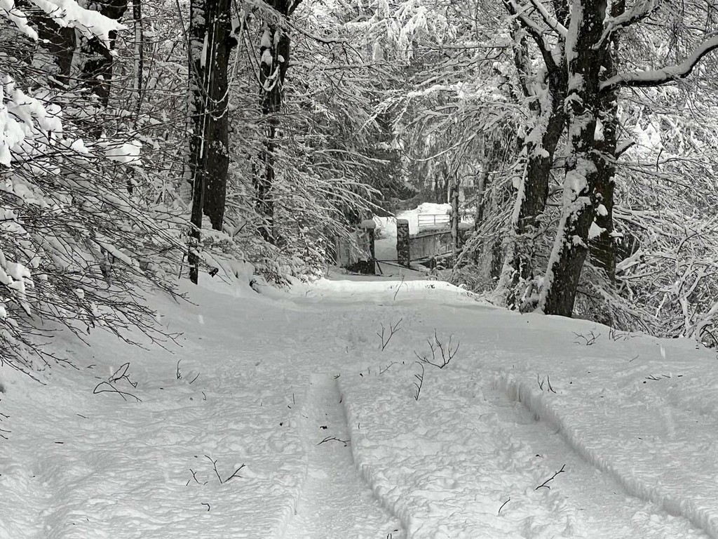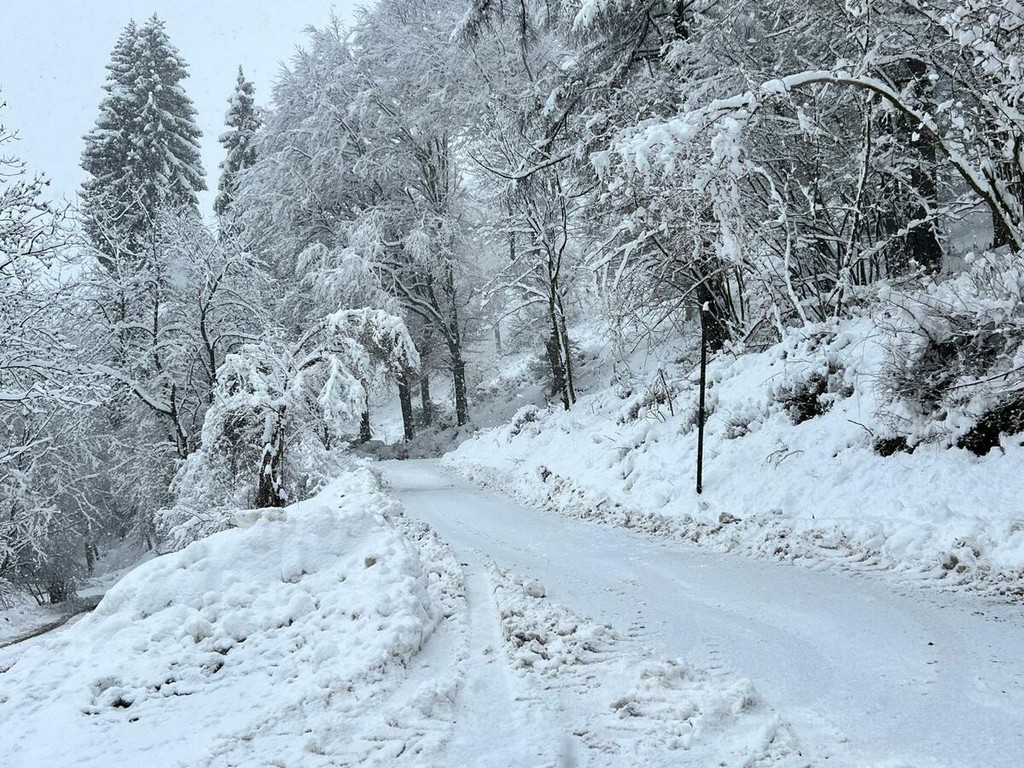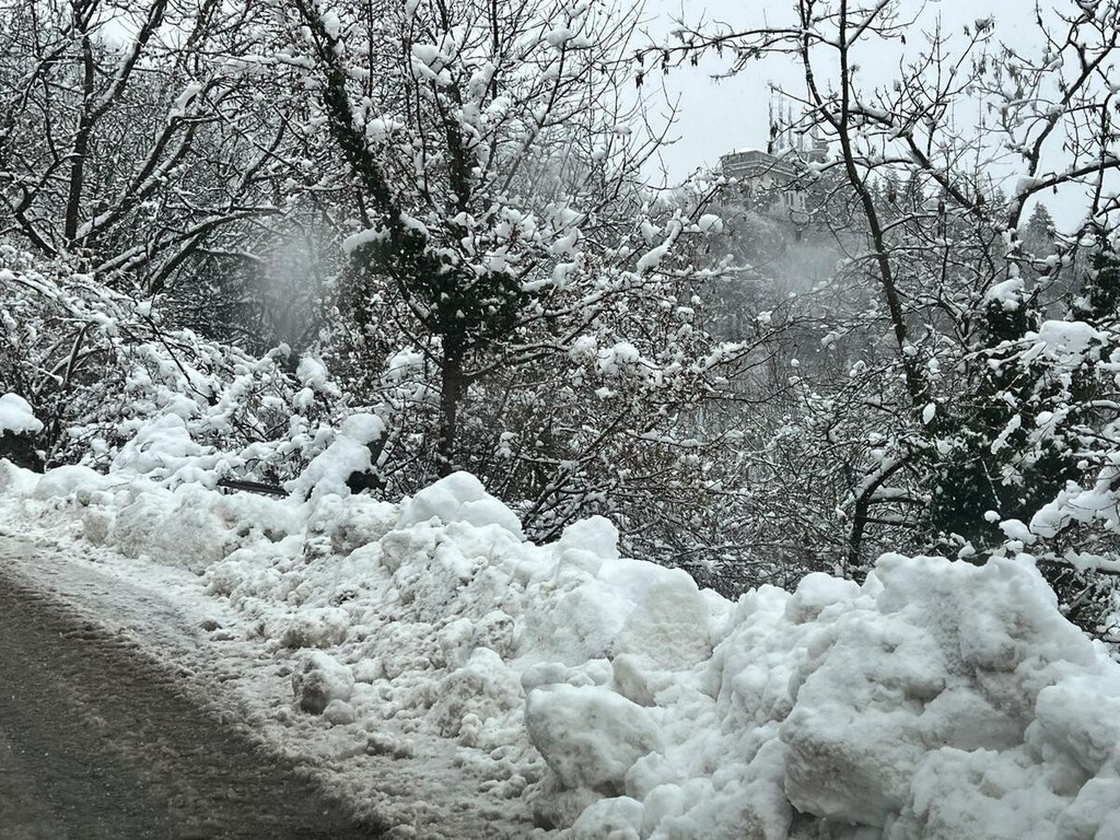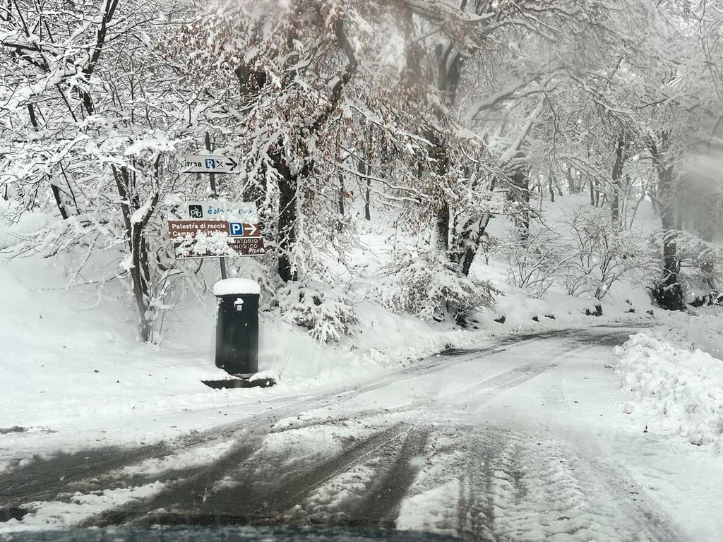 La strada imbiancata, dove fa spola uno spazzaneve, è percorribile e, prima di arrivare in vetta, volgendo lo sguardo verso il grande albergo si scorge una figura di donna in lontananza avvicinarsi lentamente alla sagoma del gigante addormentato. Poi, più su, qualche rara auto di curiosi in cerca di ispirazione e poesia, mentre la dama bianca accarezza uomini e cose, unendoli in un abbraccio tenero e in una cartolina da conservare capace, per chi sa ancora stupirsi, di farci tornare bambini. Quando la magia della neve era attesa, puntuale e benvenuta.