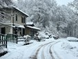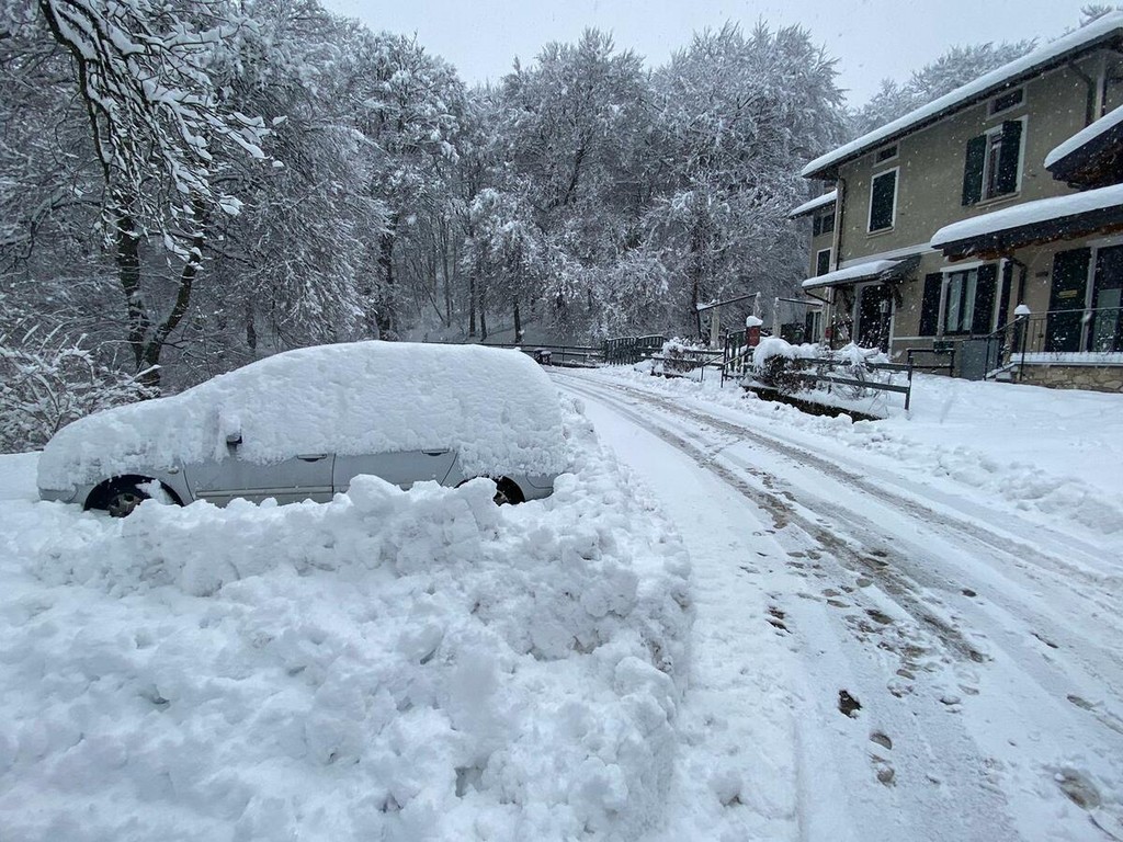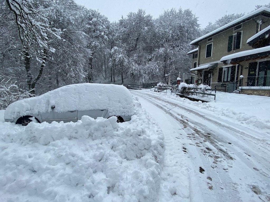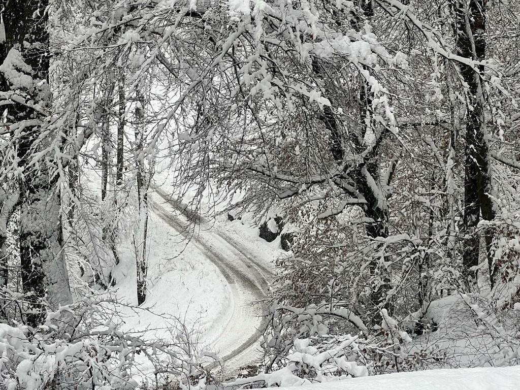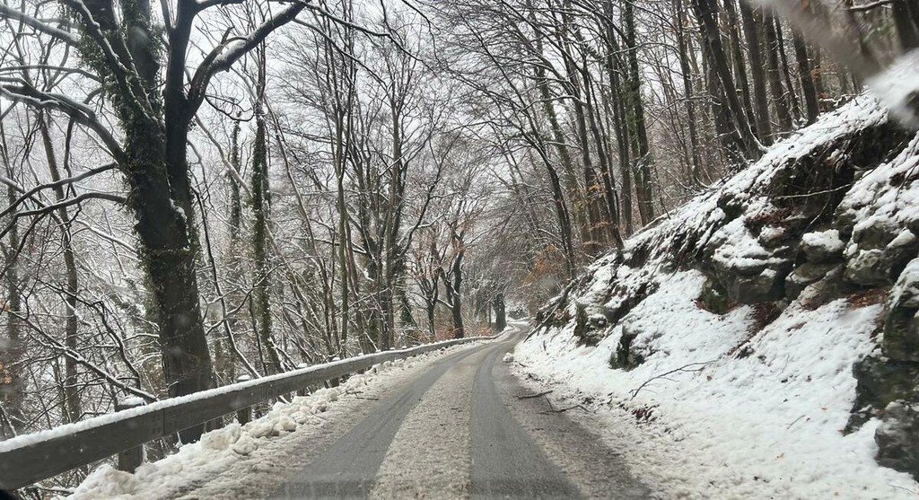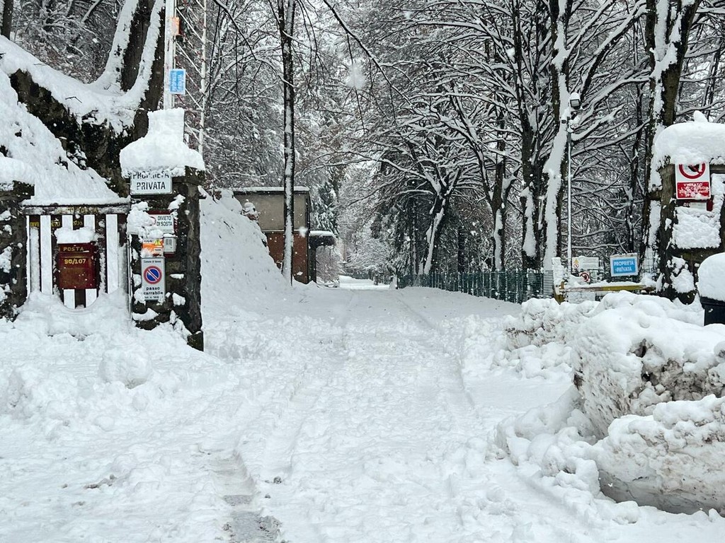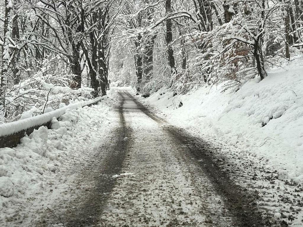 La strada imbiancata, dove fa spola uno spazzaneve, è percorribile e, prima di arrivare in vetta, volgendo lo sguardo verso il grande albergo si scorge una figura di donna in lontananza avvicinarsi lentamente alla sagoma del gigante addormentato. Poi, più su, qualche rara auto di curiosi in cerca di ispirazione e poesia, mentre la dama bianca accarezza uomini e cose, unendoli in un abbraccio tenero e in una cartolina da conservare capace, per chi sa ancora stupirsi, di farci tornare bambini. Quando la magia della neve era attesa, puntuale e benvenuta.