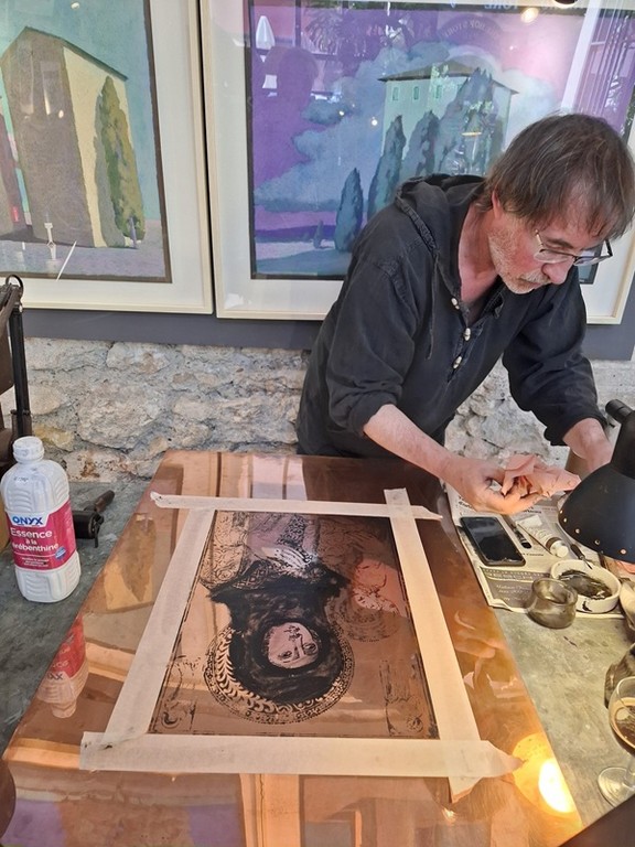 L’esposizione nasce nell’autunno del 2023 attorno a una matrice in legno inciso di origine sconosciuta, appartenente a Ghislaine Buire, raffigurante una maternità: una madre con il suo bambino, eco lontana di una Madone senza nome.