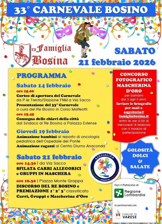 Si segnalano anche gli appuntamenti del 19 febbraio all’Ospedale del Ponte e al Centro Anaconda e il concorso la maschera d’oro per bambini dai 3 agli 11 anni (tutte le info sul sito della Famiglia Bosnia).