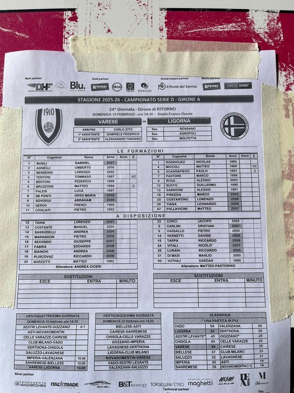 Con la conferma che rende felice la società del ds Battaglino e lo striscione della curva fuori dal Franco Ossola a chiamare a raccolta la città ("Per Varese e per il Varese tutti allo stadio") si disputa domani la sfida al vertice tra i biancorossi, quinti, e il Ligorna secondo a +14 ma a -2 dalla capolista Vado in lotta per la C grazie alla lungimiranza e agli investimenti del presidente ligure Alberto Saracco.