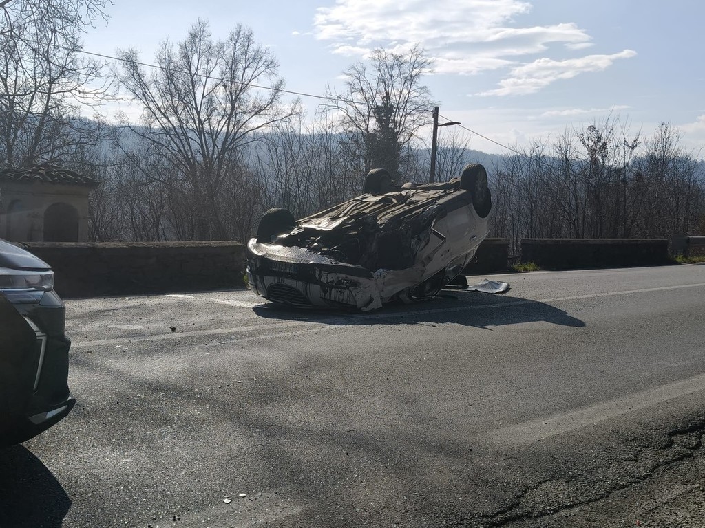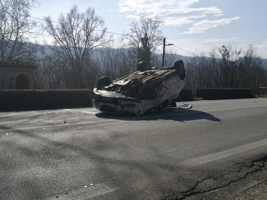 Perde il controllo della macchina, che si ribalta e finisce contro un muretto. Brutto incidente questa mattina intorno alle 11 sulla Pedemontana, poco dopo l'incrocio che porta alla Valchiusella.