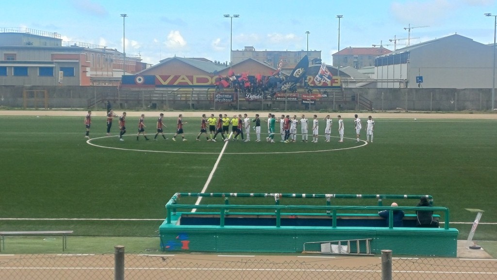 1' si parte! Completo bianco per il Vado, tenuta rossoblu per il Sestri Levante, sostenuto da una cinquantina di ultras giunti dal levante