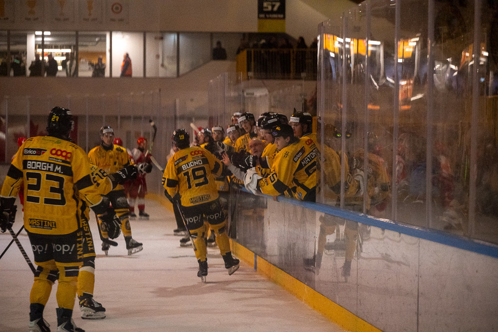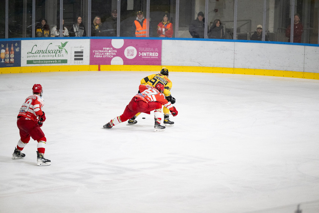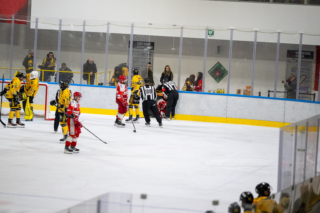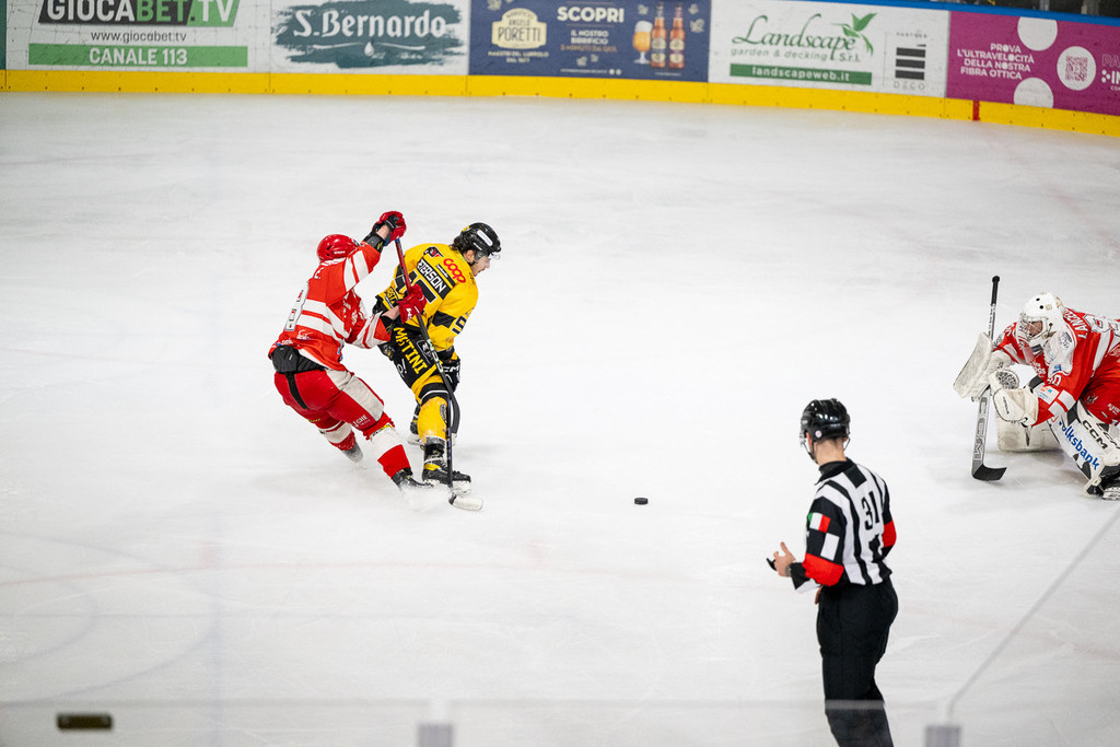 L'inizio aggressivo (dopo 13 secondi Marco Matonti schiaccia alla balaustra un avversario) porta anche al vantaggio di Terzago su un'azione in velocità servito nell'inserimento da Perino con disco sparato nell'angolino basso che fa esplodere via Albani, ma è solo un cerino che accende l'Alleghe, un fuoco che inizia a divampare ed è fermato solo dalla prima sirena. Viikila dà per Alessio sotto porta che fa 1-1, poi in 39 secondi con l'uomo in più (così si fanno i power play) arriva il raddoppio ospite: Pisarenko non tiene il disco di Iori, ma nel delirio era difficile riuscire a bloccare una sassata come quella, Isiguzo castiga sul rimbalzo: 1-2. Da lì è superiorità ospite netta, sia fisica che nel gioco, con i gialloneri a un passo dal subire il tris. Fortunatamente arriva il suono della sirena.