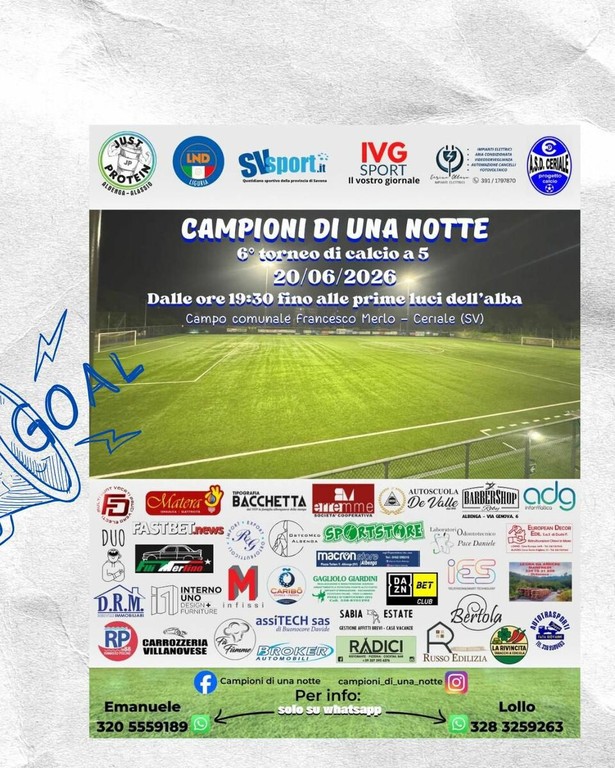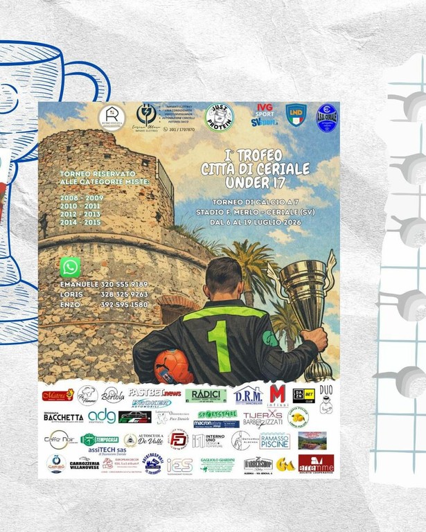 Il comprensorio ingauno si prepara vivere l'arrivo dell'estate all’insegna dello sport e della condivisione. Il calendario dei Tornei Estivi 2026, organizzato da Emanuele Scorsone e dal suo gruppo di lavoro, è pronto a trasformare l'Annibale Riva di Albenga e il Francesco Merlo di Ceriale nel cuore pulsante del calcio amatoriale e giovanile ligure.