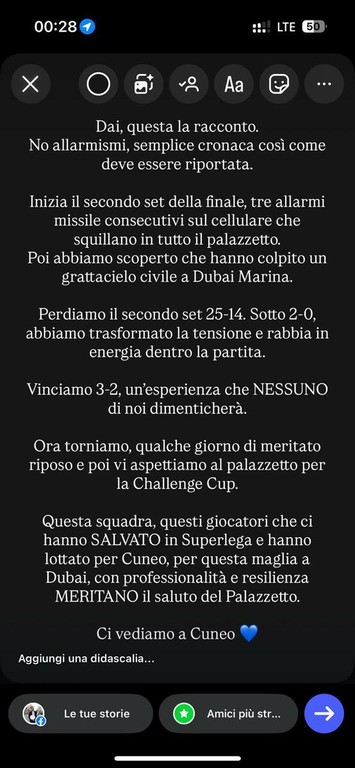 Nel pieno della finale, infatti, la partita è stata improvvisamente segnata da un momento di forte tensione. “Inizia il secondo set della finale, tre allarmi missile consecutivi sul cellulare che squillano in tutto il palazzetto. Poi abbiamo scoperto che hanno colpito un grattacielo civile a Dubai Marina”.