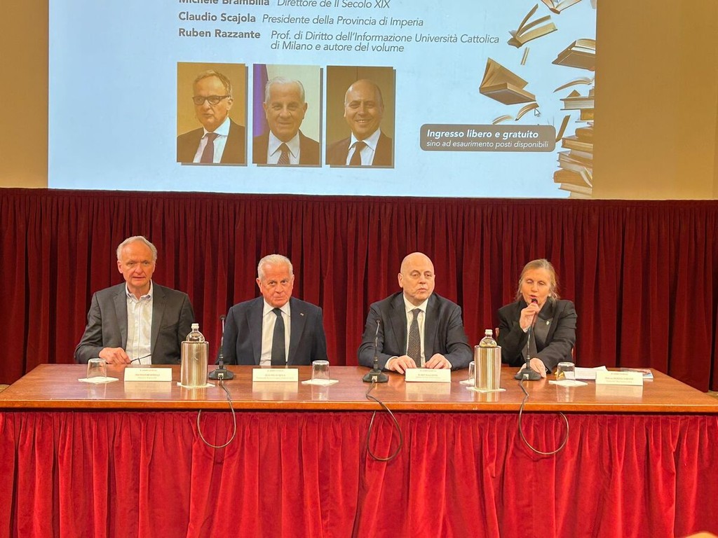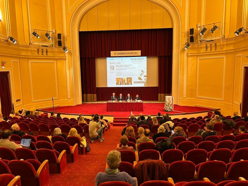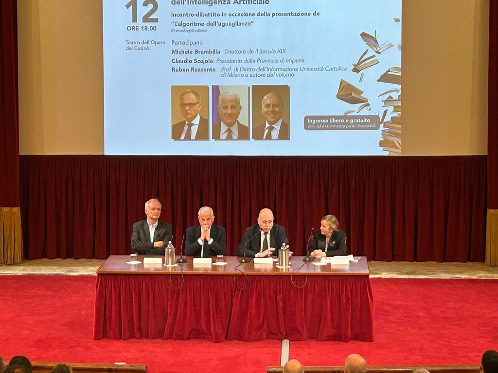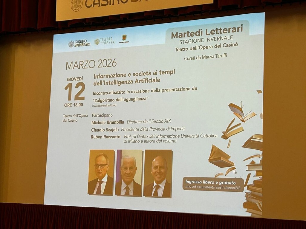 Al Teatro dell’Opera del Casinò di Sanremo si è svolto questo pomeriggio un nuovo appuntamento della rassegna culturale dei Martedì Letterari, curata da Marzia Taruffi, dedicato a uno dei temi più attuali del dibattito contemporaneo: “Informazione e società ai tempi dell’Intelligenza Artificiale”. All’incontro hanno preso parte Michele Brambilla, direttore de Il Secolo XIX, Claudio Scajola, presidente della Provincia di Imperia e sindaco del capoluogo, e Ruben Razzante, docente di Diritto dell’informazione all’Università Cattolica di Milano e autore del volume “L’algoritmo dell’uguaglianza”.