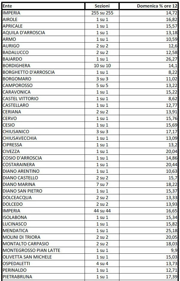 Guardando ai numeri sul territorio, nel capoluogo, a Imperia, ha votato il 16,65% degli elettori. Tra i centri principali spicca Diano Marina con il 18,22%, mentre Sanremo si ferma al 14,54% e Ventimiglia registra uno dei dati più bassi con l’11,83%.