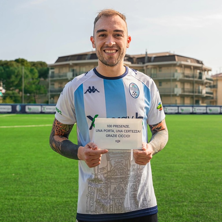 Prima del fischio d'inizio del match contro il Busalla, la società del presidente Ricciardi ha voluto celebrare la tripla cifra raggiunta negli almanacchi dal portiere, arrivato alla centesima presenza con la casacca pietrese.
