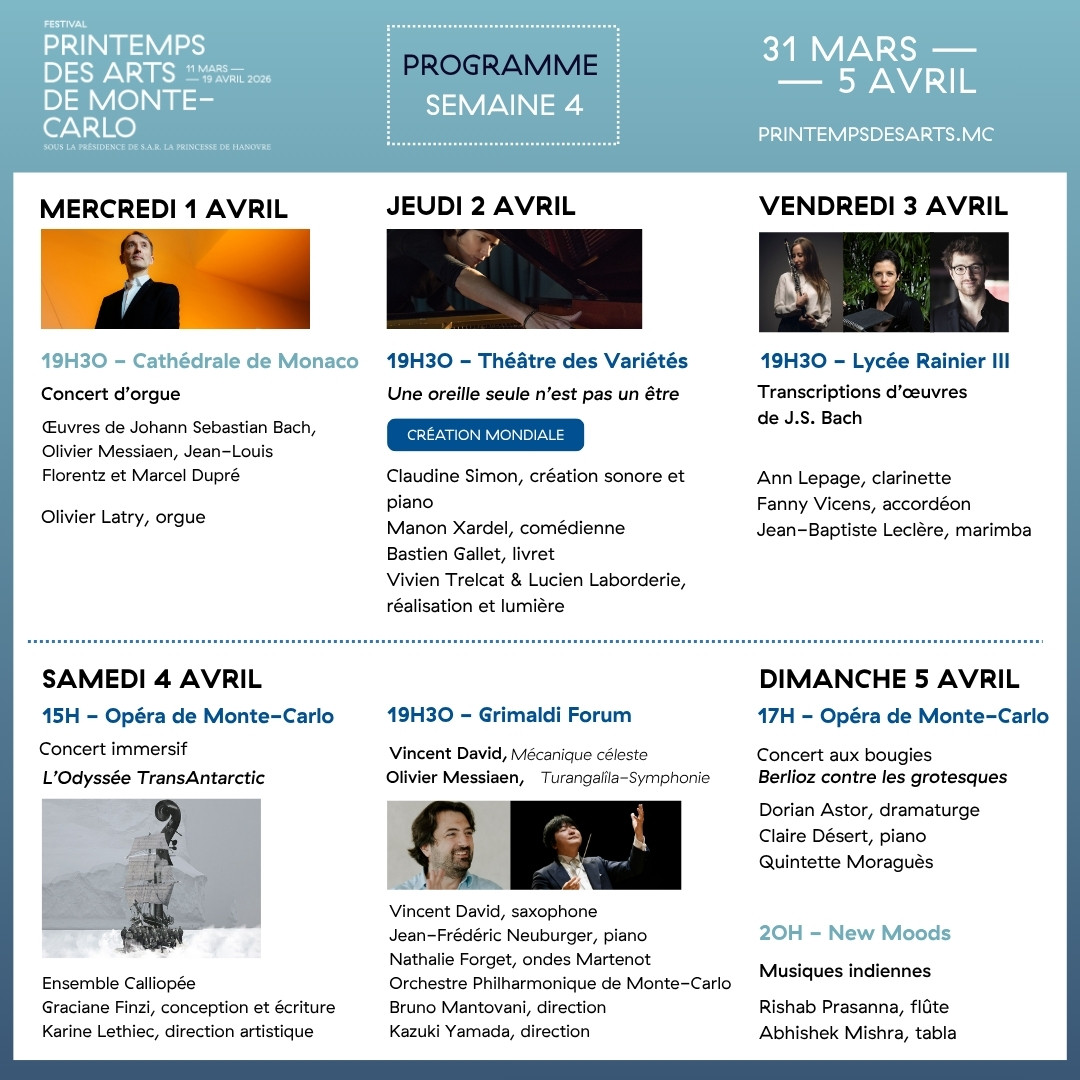 Sabato 4 aprile si configura come una vera e propria “giornata-cattedrale”: dalla masterclass del pianista Jean-Frédéric Neuburger al concerto immersivo L’Odyssée TransAntarctic all’Opéra di Monte-Carlo, fino alla conferenza dedicata al linguaggio orchestrale di Messiaen al Grimaldi Forum.