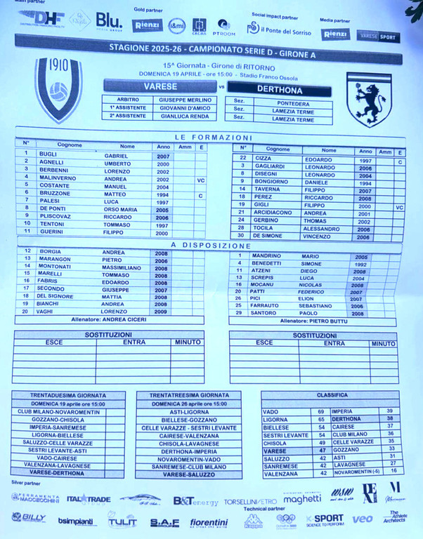Arrivati a questo punto non conta certo la lista delle assenze, da una parte (il portiere Taina e Bertoni, squalificati, oltre agli infortunati Qeros e Sovogui; rientra Tentoni, mentre Barzotti e Bruzzone sono acciaccati) e dall'altra (l'ex Marcaletti e la punta Turco su tutti), quella del Derthona guidato da Pietro Buttu che lotta per salvarsi (è a +2 dalla zona playout). Biancorossi a -2 dal quinto posto e dai playoff, ma a distanze siderali anche dalla Biellese, terza, e dal Sestri quarto, e reduci da due pari e due ko nelle ultime quattro gare ed è davvero inutile girare attorno alla realtà: la coppia Ciceri-Battaglino non ha convinto, né ha prodotto risultati all'altezza del Varese. Capitolo promozione: il Vado può festeggiare la C dopo 78 anni se batterà al Chittolina la Cairese e se il Ligorna perderà in casa contro la Biellese. In caso contrario tutto verrebbe rimandato alla prossima giornata.