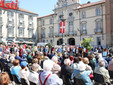 Il sindaco Maurizio Rasero ha raggiunto la piazza direttamente dall'aeroporto di Milano, dopo una visita istituzionale in Giappone che lo aveva tenuto lontano dalla città per giorni. Nelle ultime venti ore ne aveva trascorse sedici in volo.