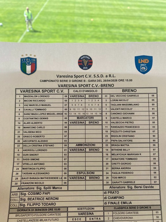 Varesina (4-3-1-2) Maddalon; Miconi, Alari, Cavalli, Vaz; Grieco, Arcopinto, Valisena; Sainz Maza; Manicone, Costantino. A disp.: Della Cristina, Andreoli, Guri, Sassi, Vitiello, Martinoia, Tassani, Baud Banaga, Franzoni. All. Marco Spilli