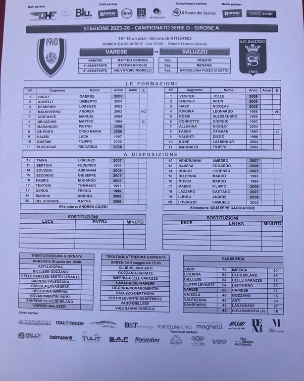 E il Varese? Difende il quinto posto e lo zuccherino playoff in casa contro il Saluzzo, prima di andare a fare visita alla Lavagnese già retrocessa, mentre il Chisola sesto e in caduta libera staccato di un punto ospiterà, guarda caso, la stessa avversaria ligure già caduta in Eccellenza che nell'ultima di campionato ospiterà i biancorossi. Evidente che servirà una vittoria alla squadra di Ciceri, sempre alle prese con molti infortuni, contro un avversario allenato da Cacciatore che negli scorsi anni ne ha combinate di tutti i colori al Varese. Occhi puntati anche sul futuro del club, tra novità possibili e una stagione, la prossima, che non potrà non vedere il Varese lottare per la serie C. Costi quel che costi.