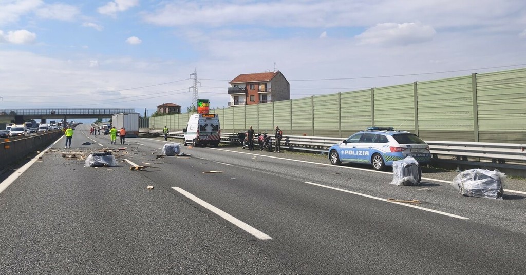 La perdita di carico di un autoarticolato ha provocato un sinistro che ha coinvolto tre veicoli. Due le persone lievemente ferite (codice verde), portate all'ospedale Santa Croce di Moncalieri.